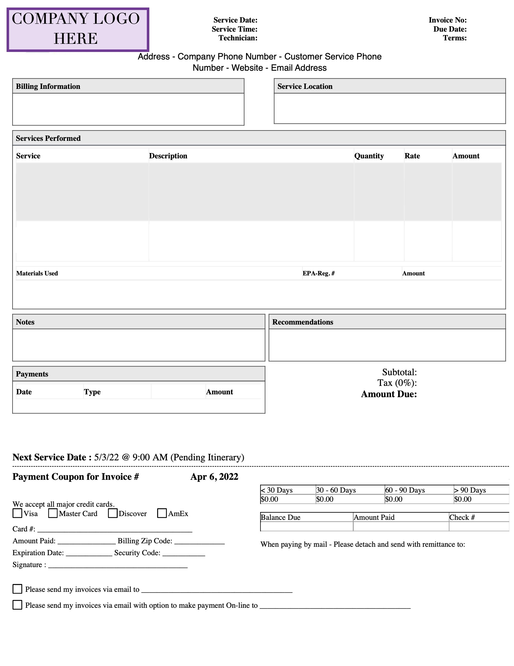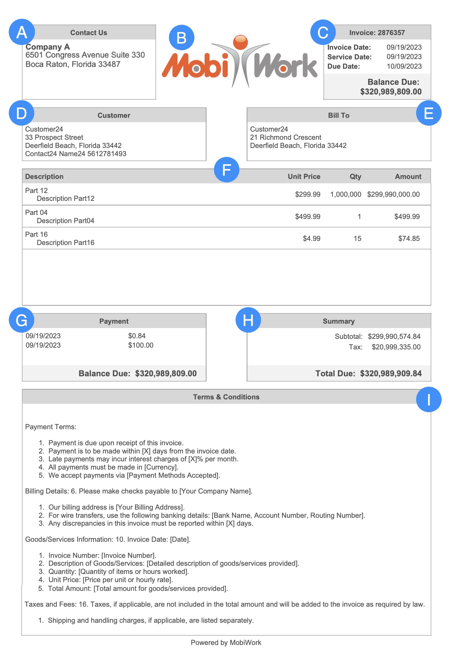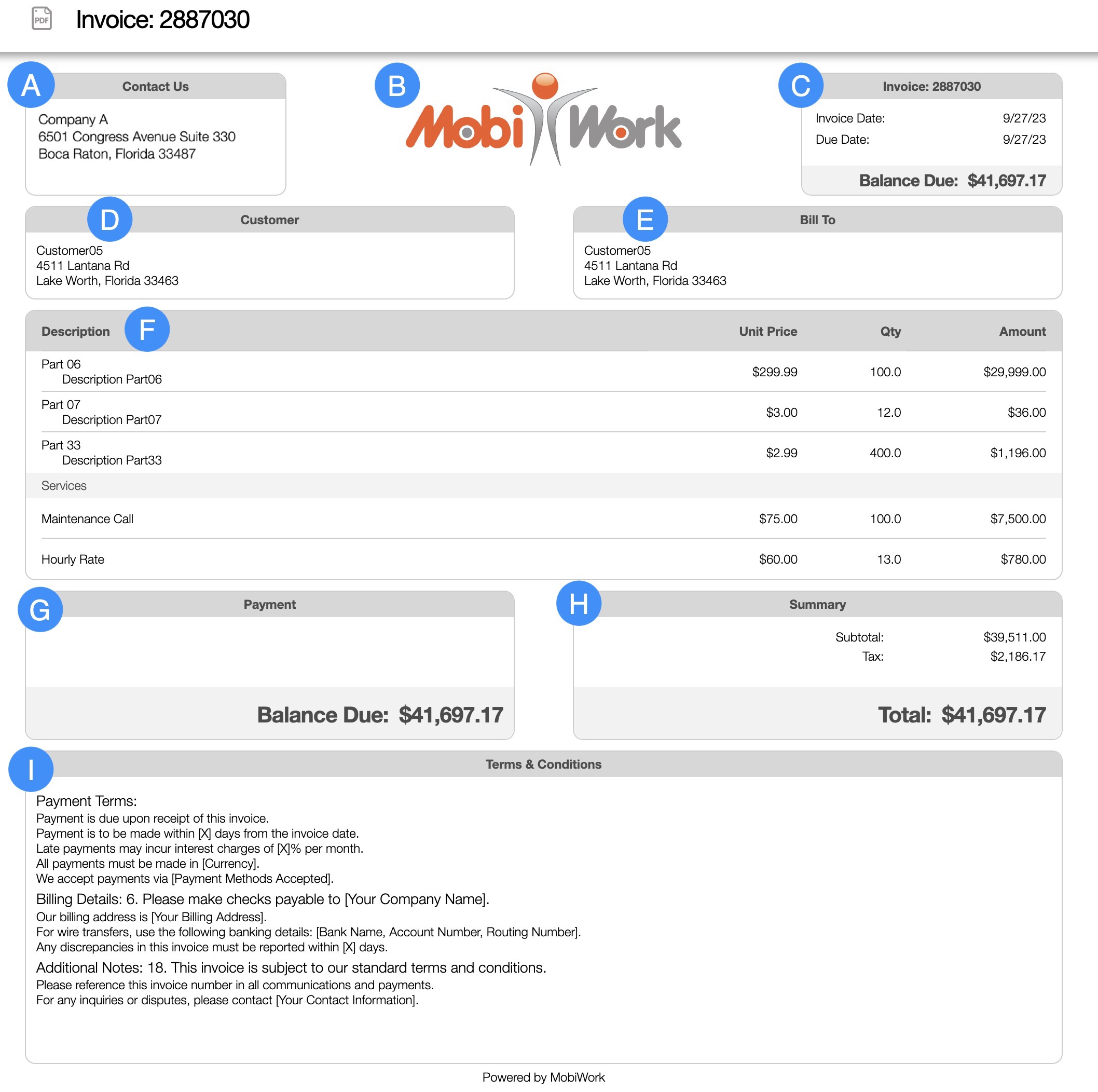 The image below is an example of a customized invoice PDF that MobiWork can personalize for your company: