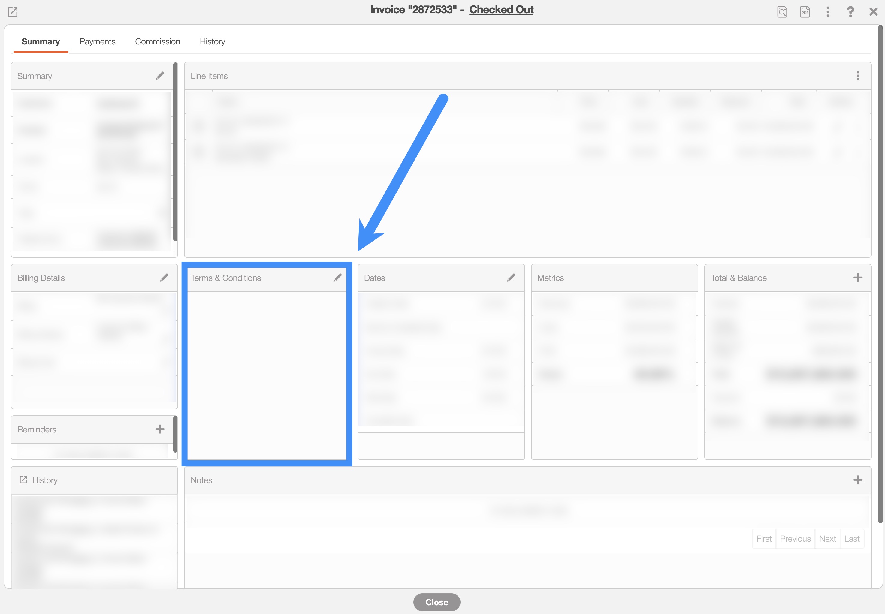 After you added your terms and conditions on the Settings page, you will be able to access them on the "Summary" tab of the View Invoice pop-up window: