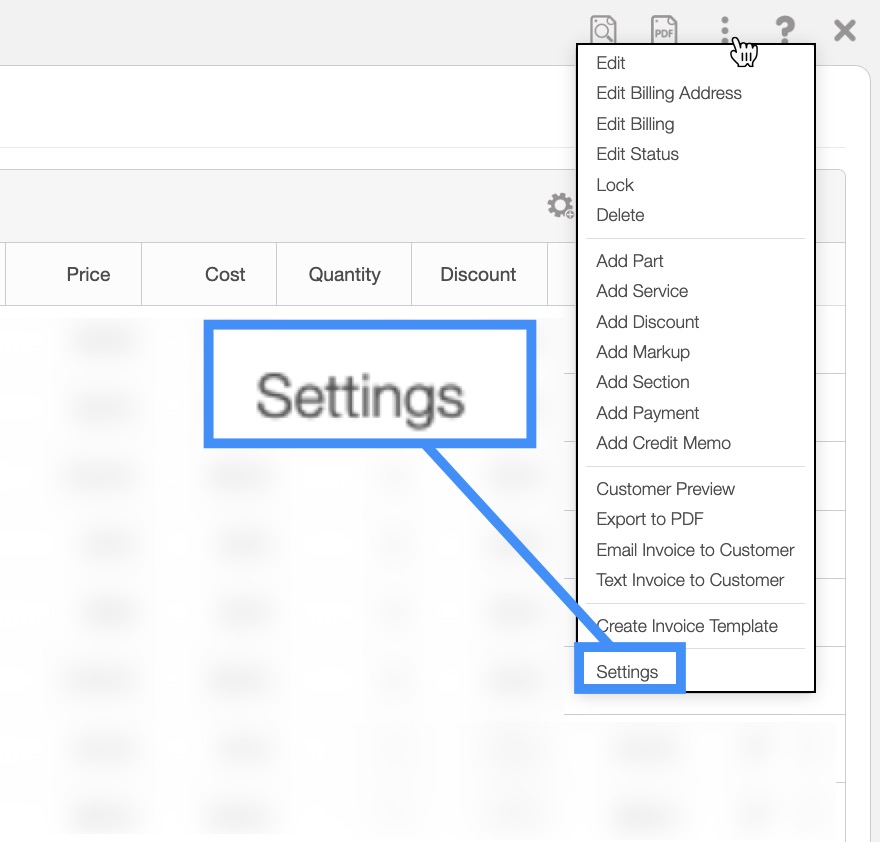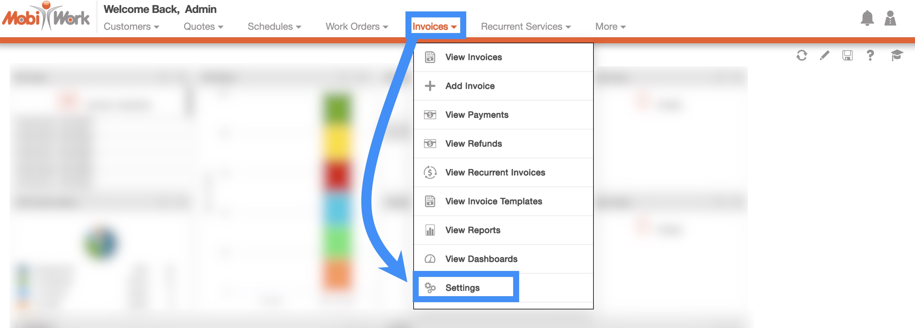 - You can directly access the Settings page by hovering over the Invoices feature from your MobiWork menu, and clicking on the "Settings" option: