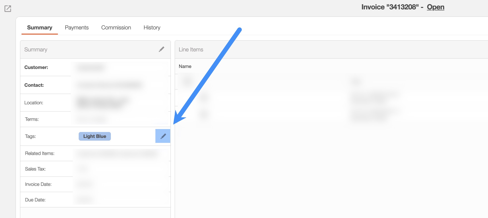 To add a new tag to your invoice, open the View Invoice pop-up window and in the "Summary" panel click on the Plus Sign for the "Tags" column; if you have already added tags to your invoice, this icon will turn into a Pencil icon: