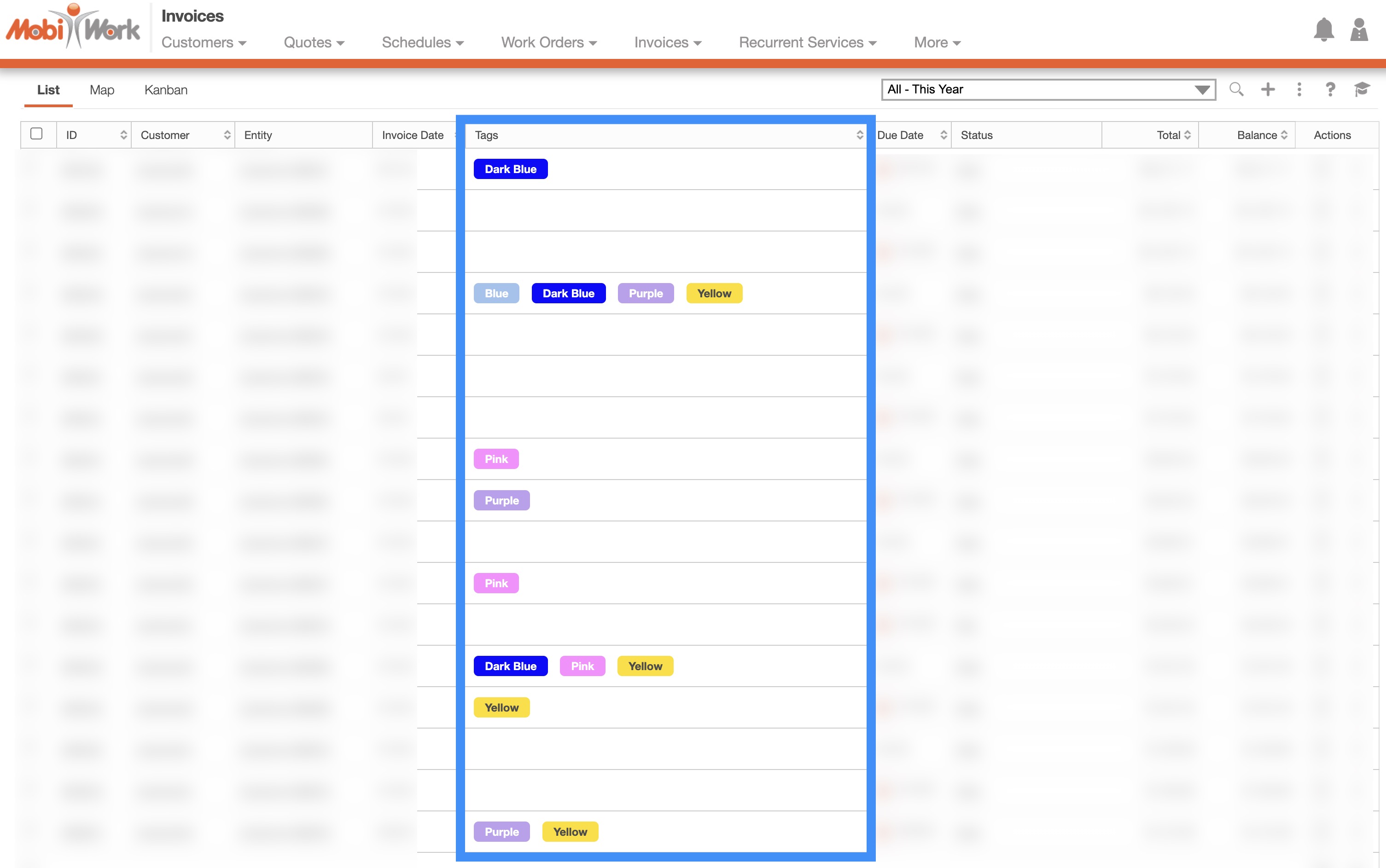 After adding tags to your Invoice settings page, a new column header will appear in your "List" tab. When you tag an invoice, you will immediately see its associated tags in a convenient, at-a-glance display within the "List" tab: