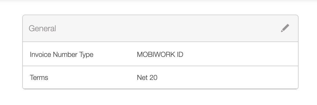 The "General Settings" section will allow you to edit the terms of your invoices as well as indicate how your invoices are registered in MobiWork: