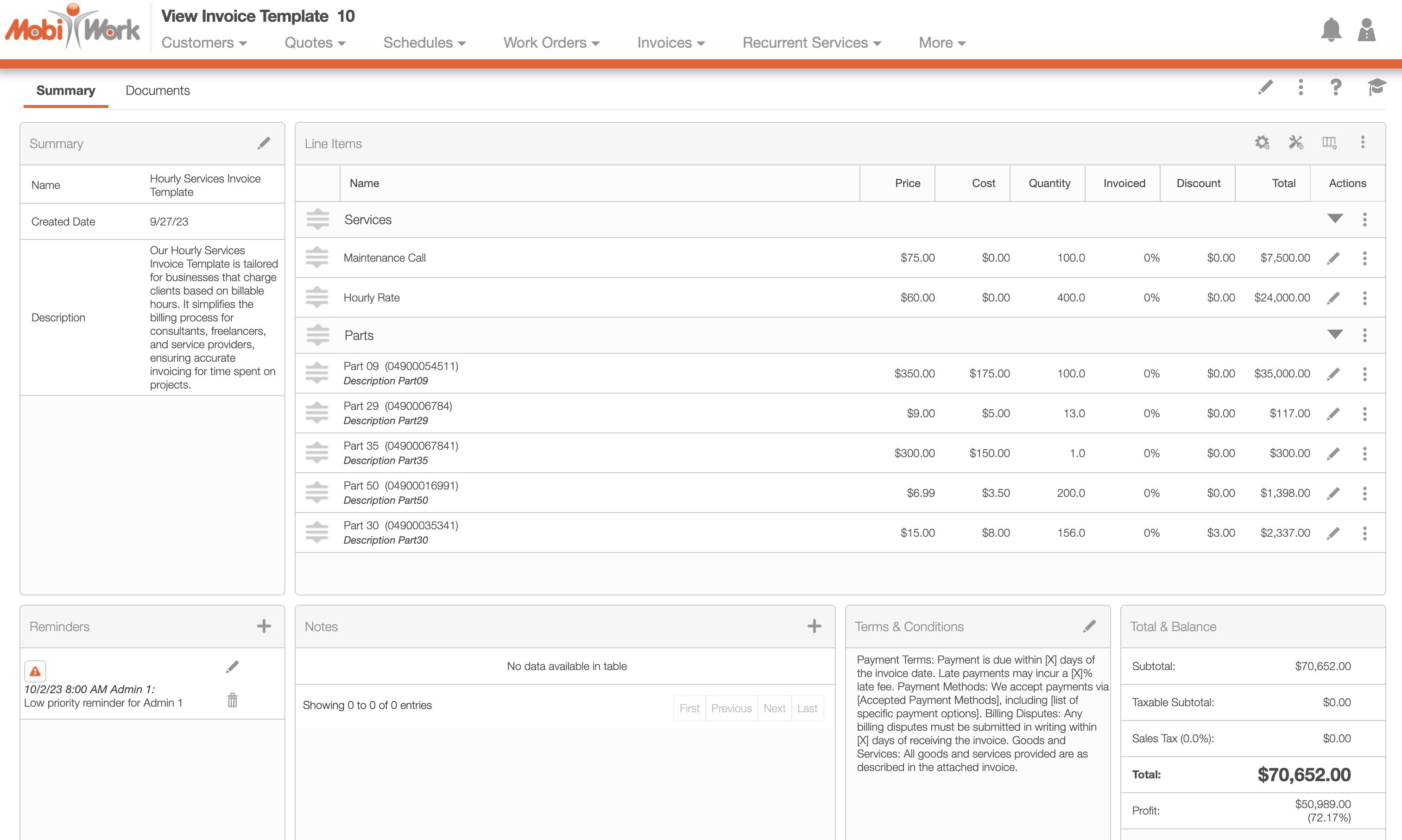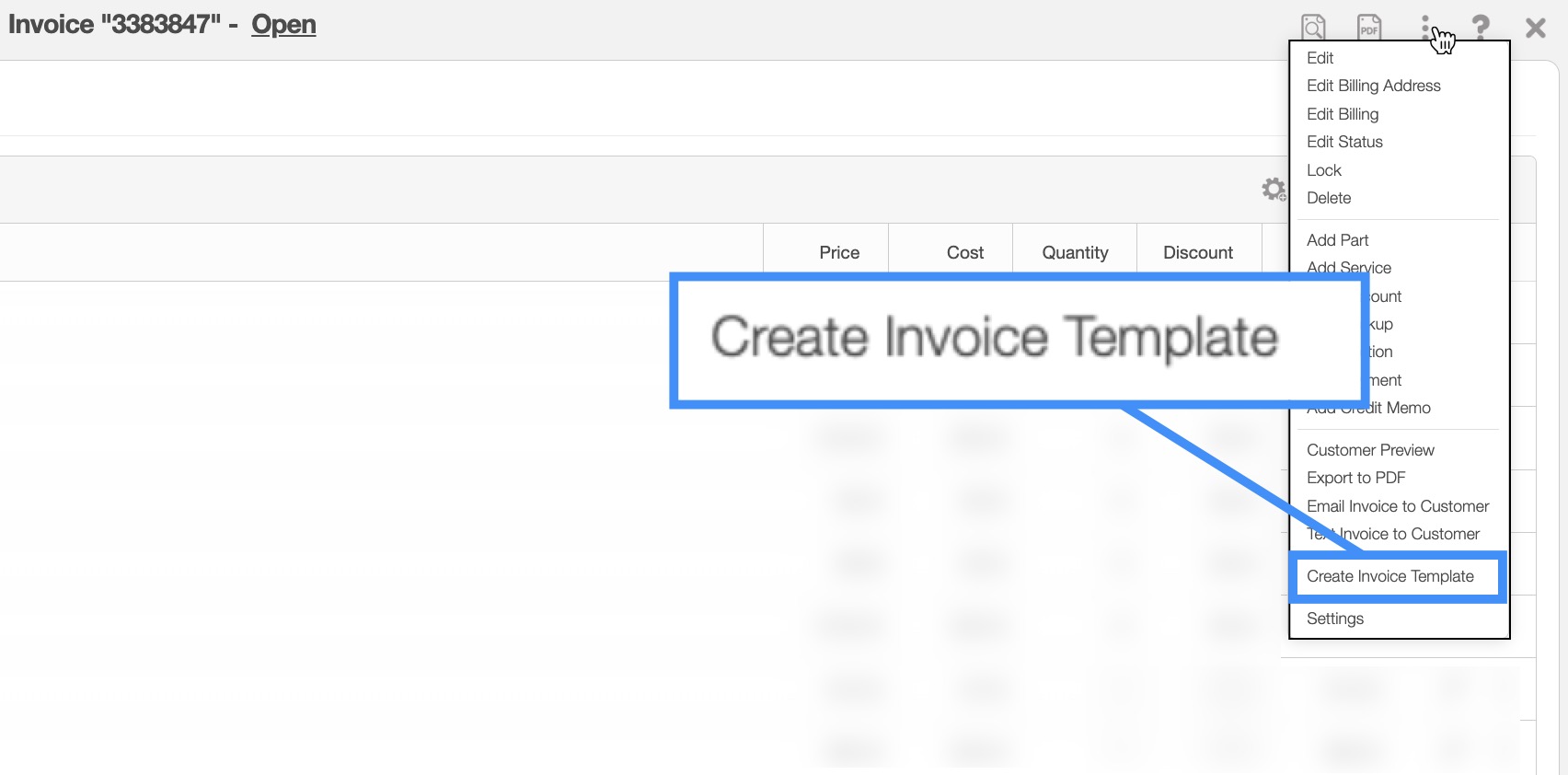 Note: The invoice's parts, services, and title (description) will carry over to the new template. Any reminders, notes, section headers, terms & conditions will not carry over.