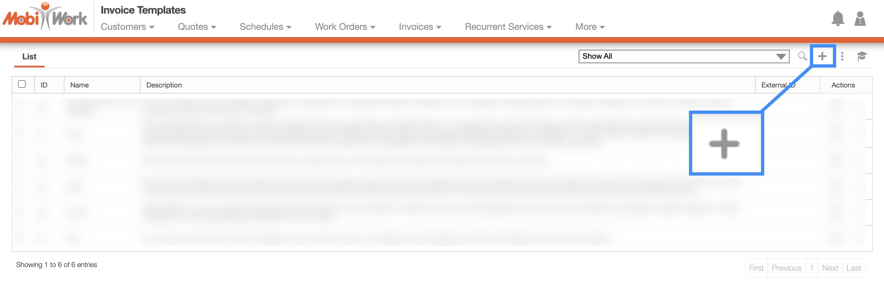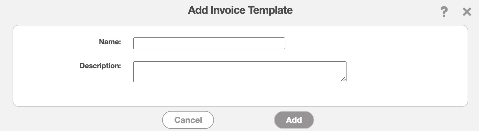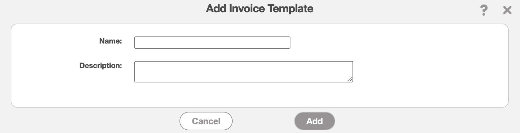 From this page, click on the Plus Sign button. Once you click on this button, the Add Invoice Template pop-up window will appear. Enter the name and a description of the invoice template: