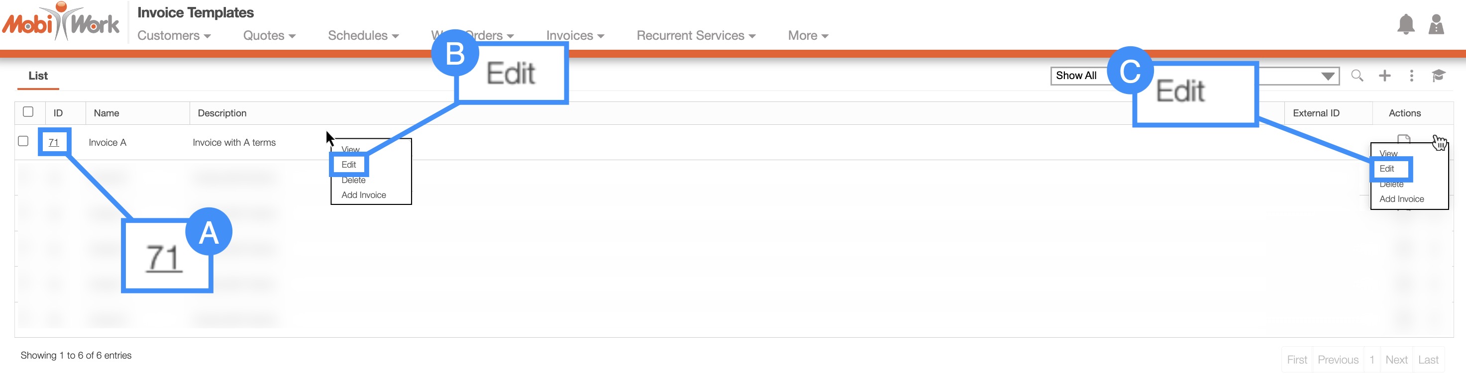 - By clicking on the desired invoice template ID and from the View Invoice Template pop-up window select either the Pencil icon or the Individual Actions button:
