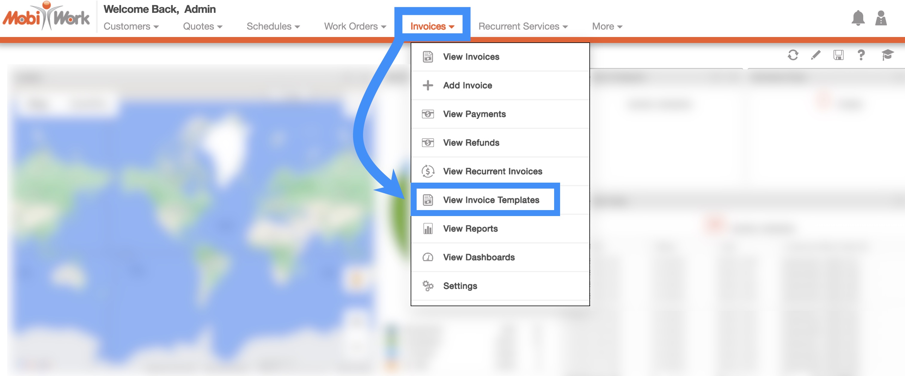 You can access the Invoice Templates page by hovering over the Invoice feature from your MobiWork menu and clicking on the "View Invoice Templates" option: