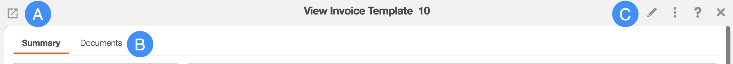 The "Documents" tab of the View Invoice Template pop-up window is very similar to the "Documents" tab of the View Invoice pop-up window: