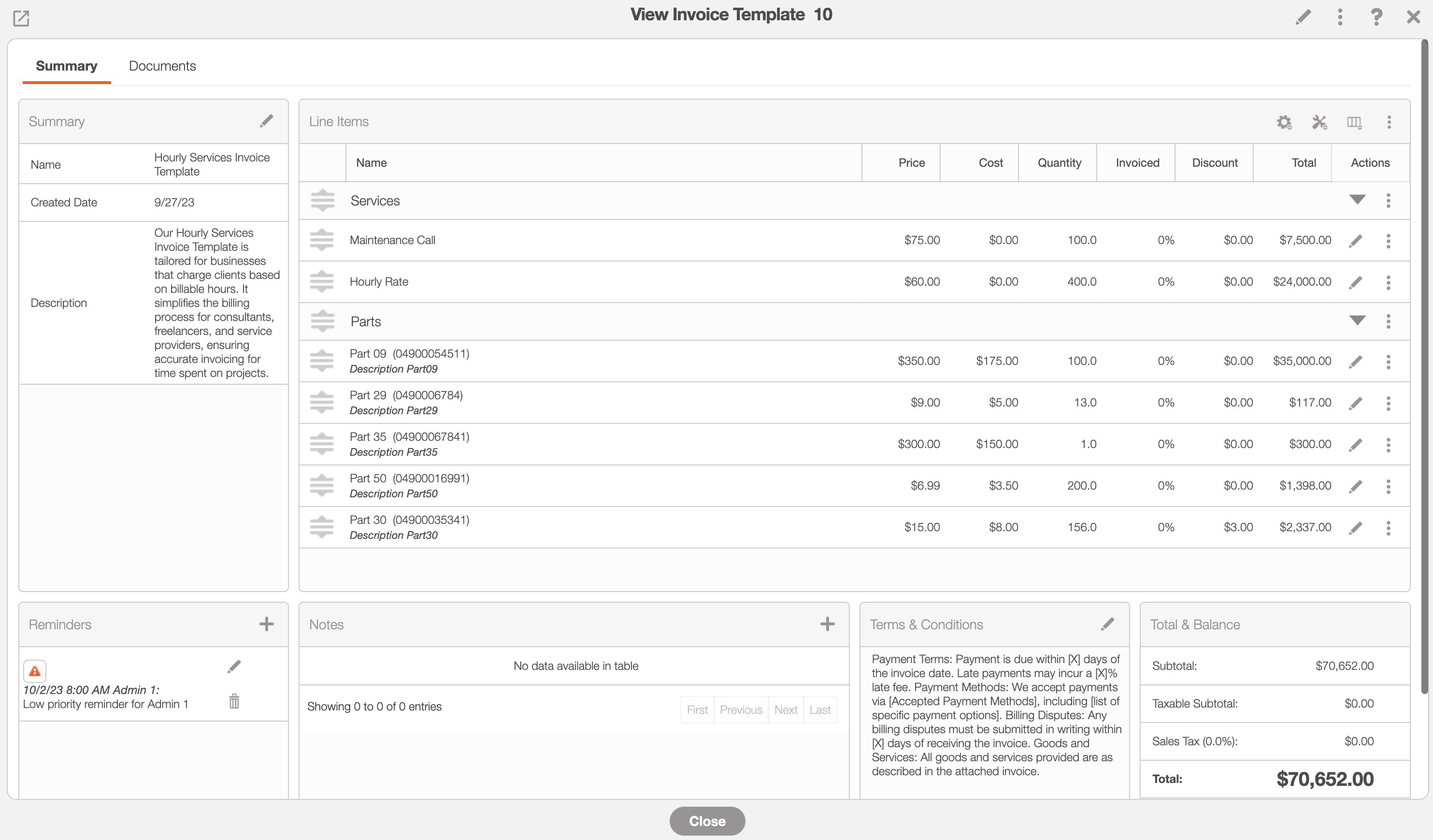 The "Summary" tab of the View Invoice Template pop-up window will display the line items of the invoice, the name of the template, when it was created, and the notes associated with the invoice: