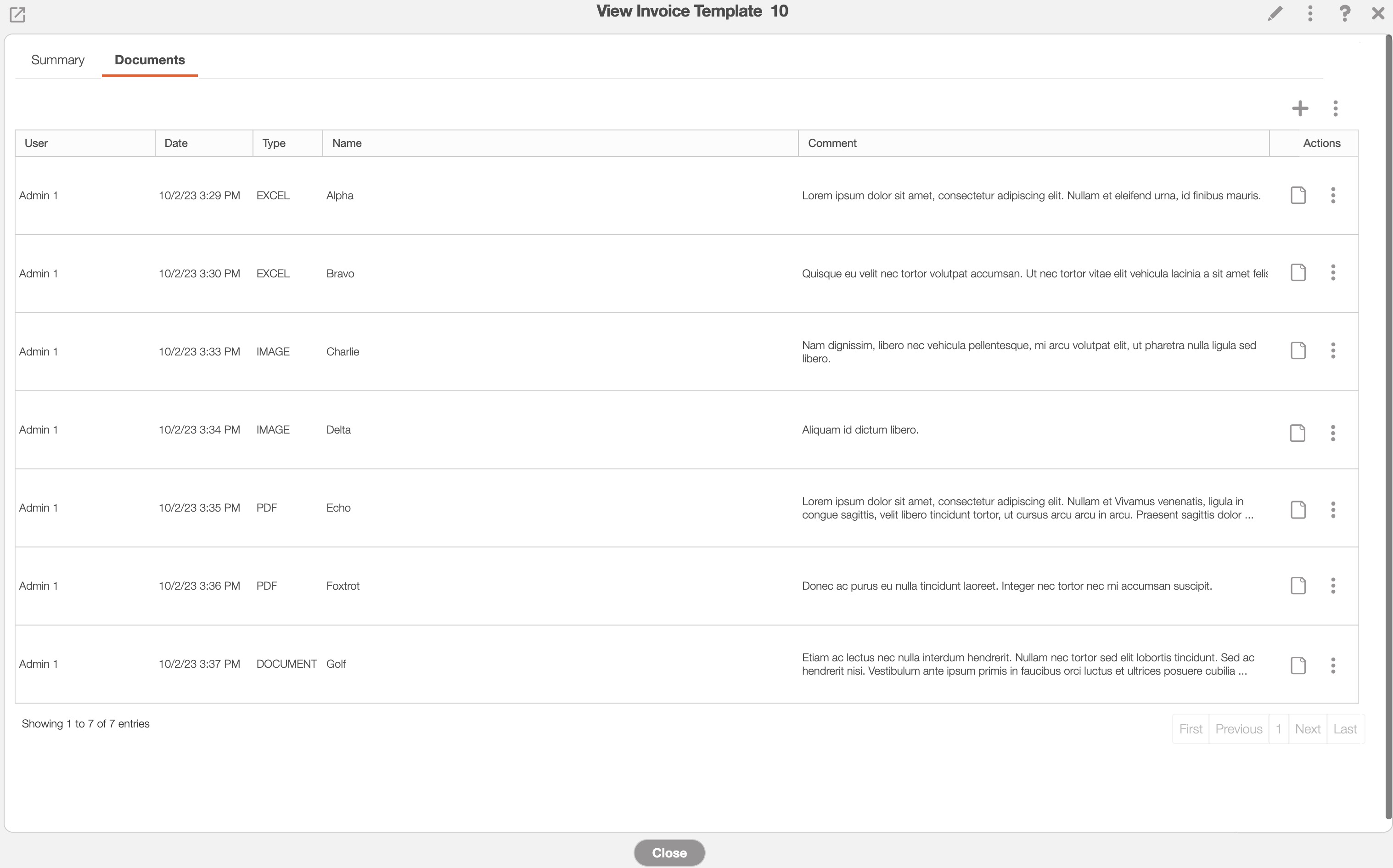 There are two tabs in the View Invoice Template pop-up window: "Summary" and "Documents." Each tab displays different information regarding the invoice template: