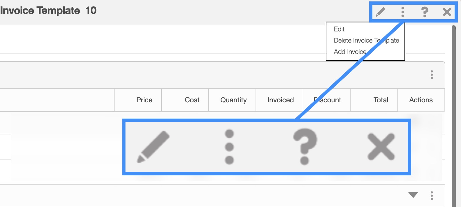 In the upper right corner of the View Invoice Template pop-up window there will be four buttons that will allow you to perform additional actions on the invoice template: