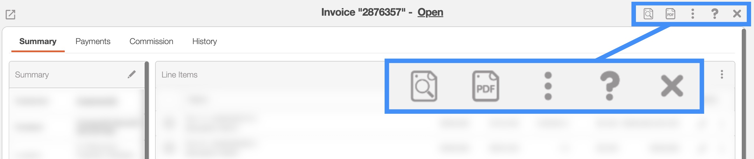 The Invoice's Upper Right Corner Actions can be found in the top-right corner of the View Invoice pop-up window. These actions are located in this section, regardless of the tab you are on: