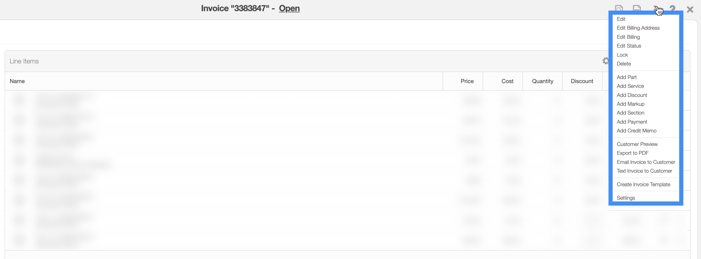 By clicking on the Individual Actions of a specified part, service, markup, discount, or section you can edit the information or remove it entirely.