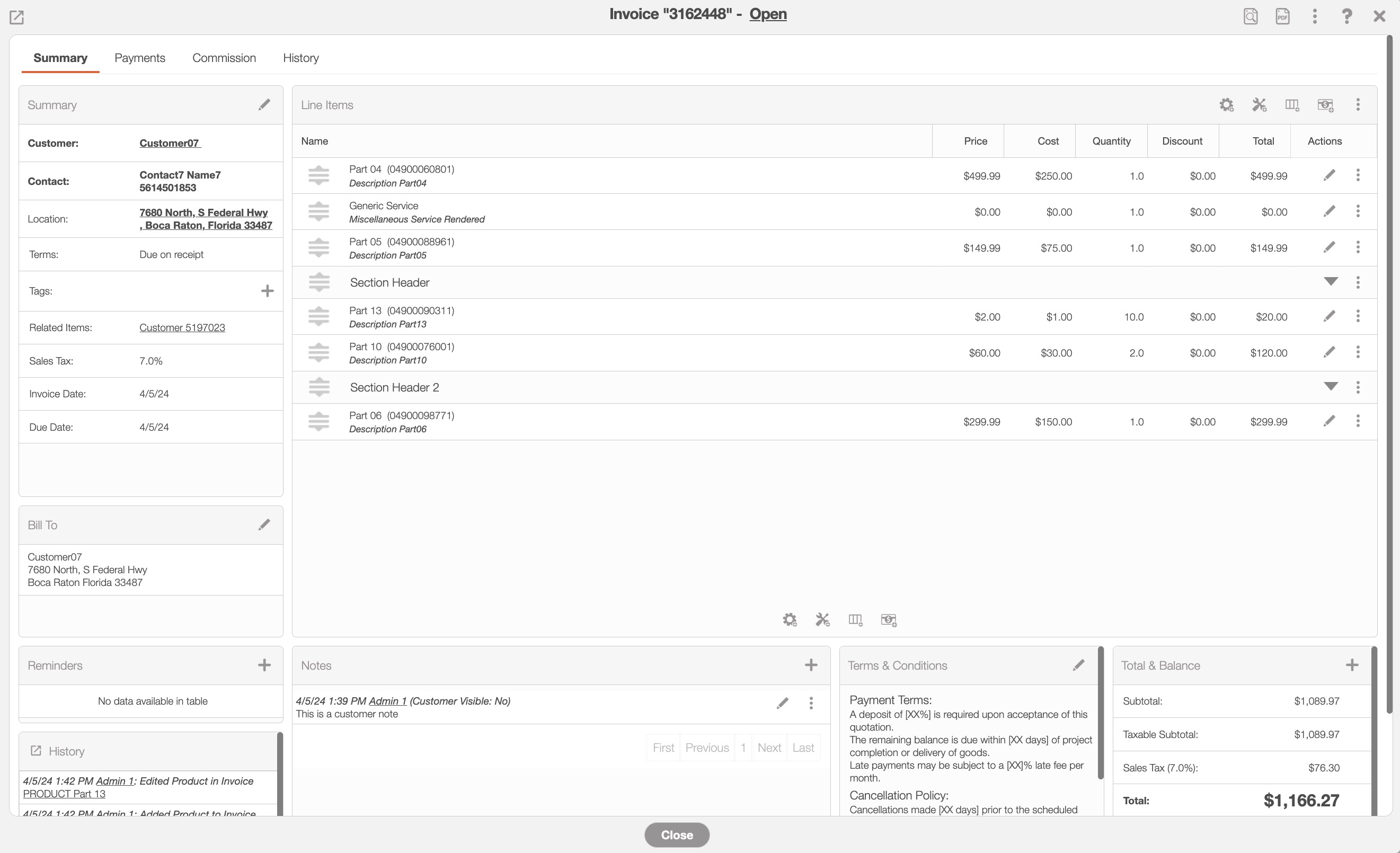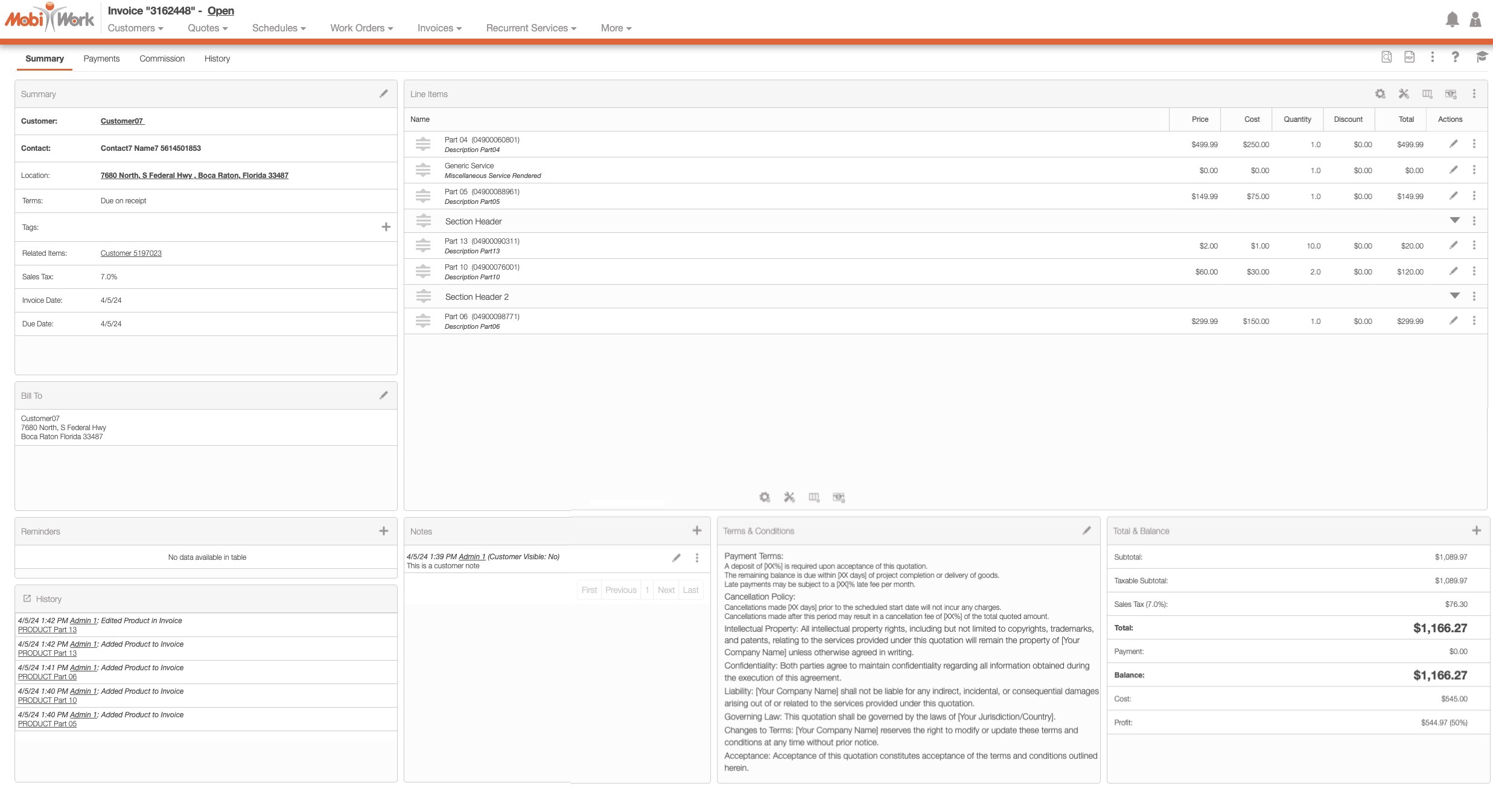 The panels found on the "Summary" tab will summarize the data from the other View Invoice tabs, including customer information, reminders, line items, the balance due, and more: