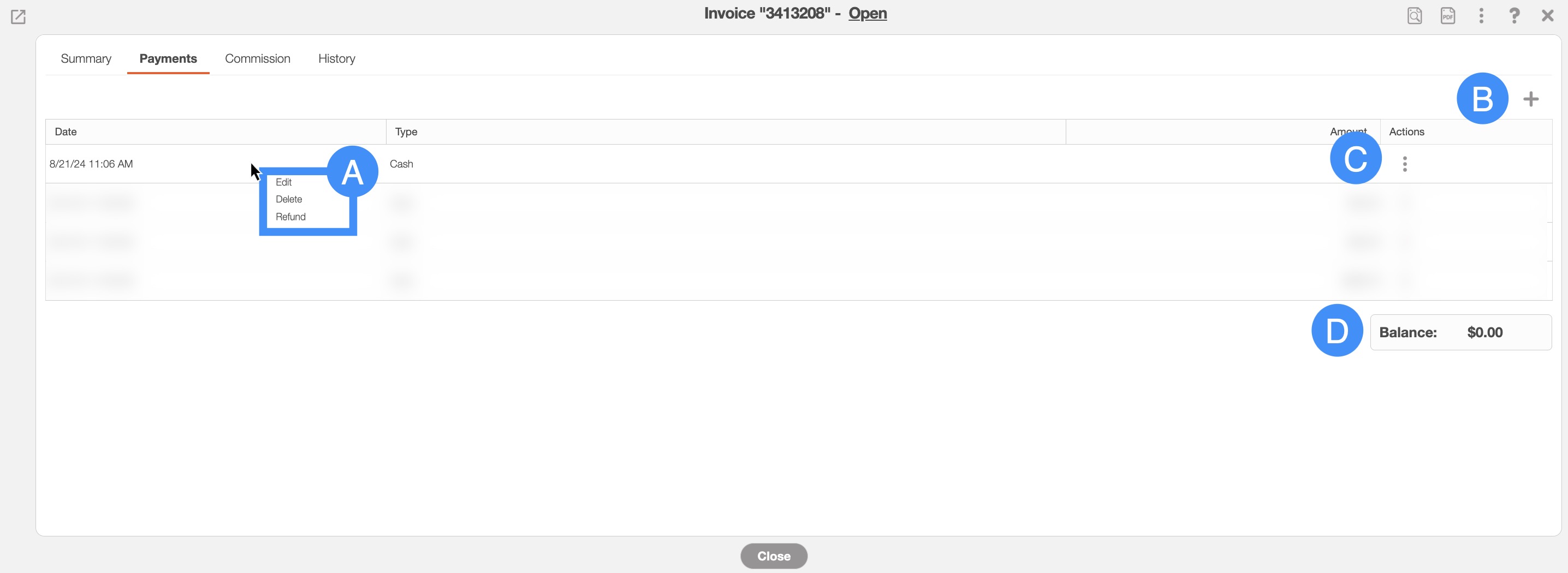 - The Plus Sign allow you to add a payment to the invoice.