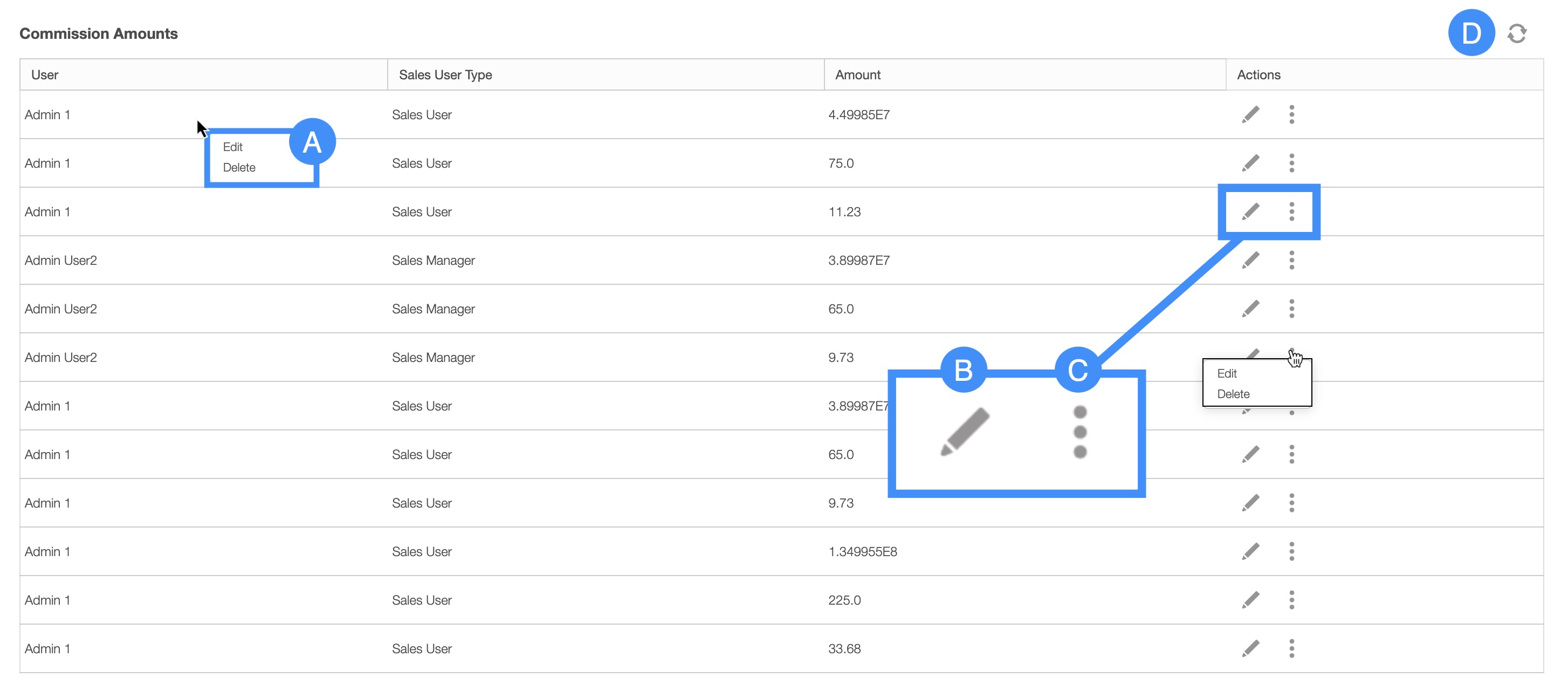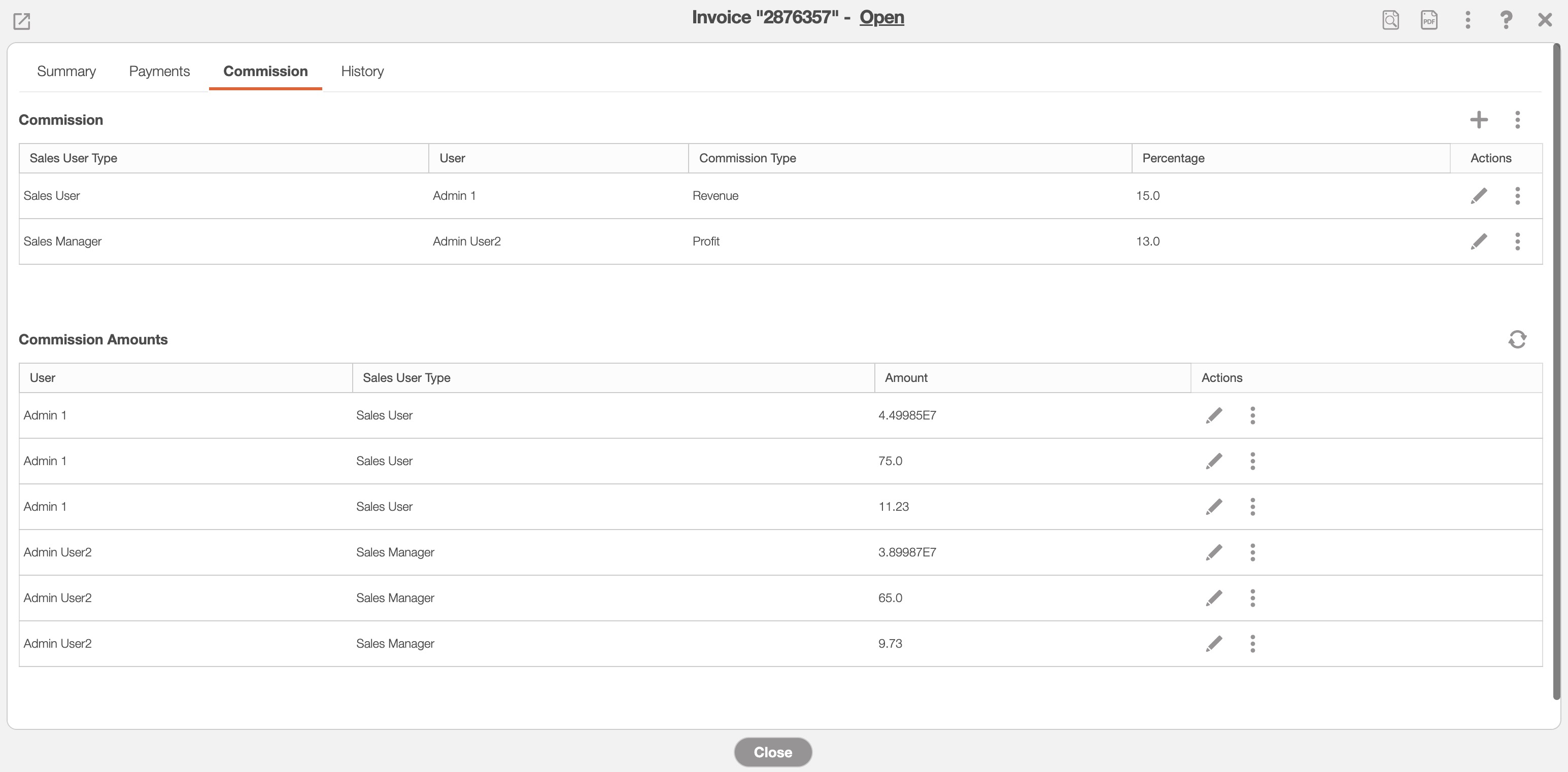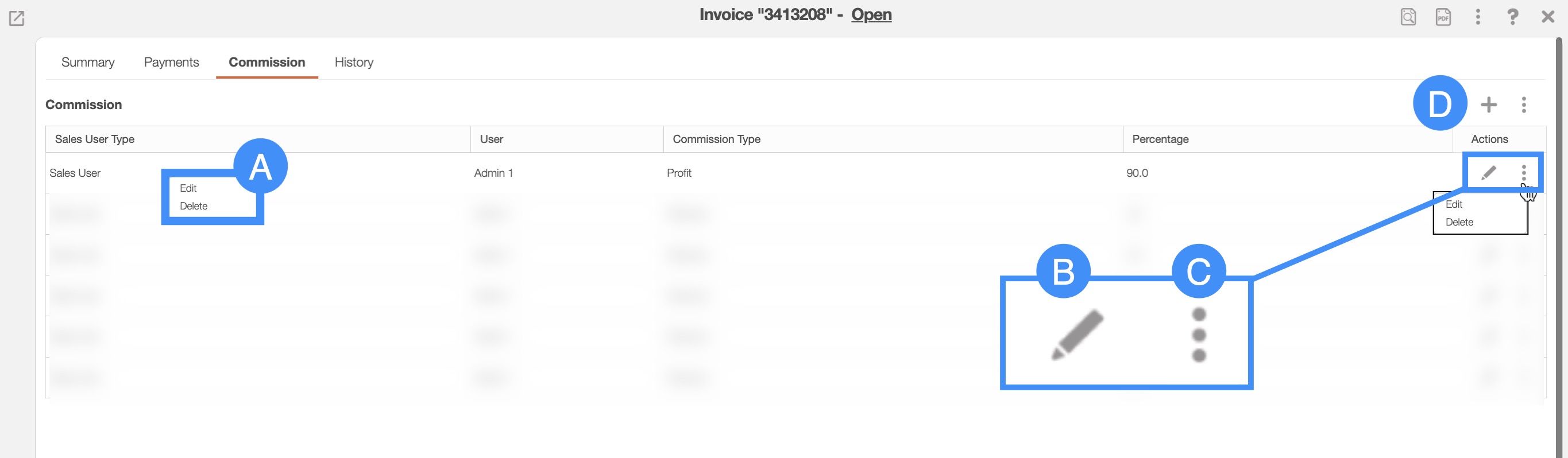 - The Individual Actions are identical to the right-click actions and will allow you to edit the commission amount for the sales user or delete the commission.
