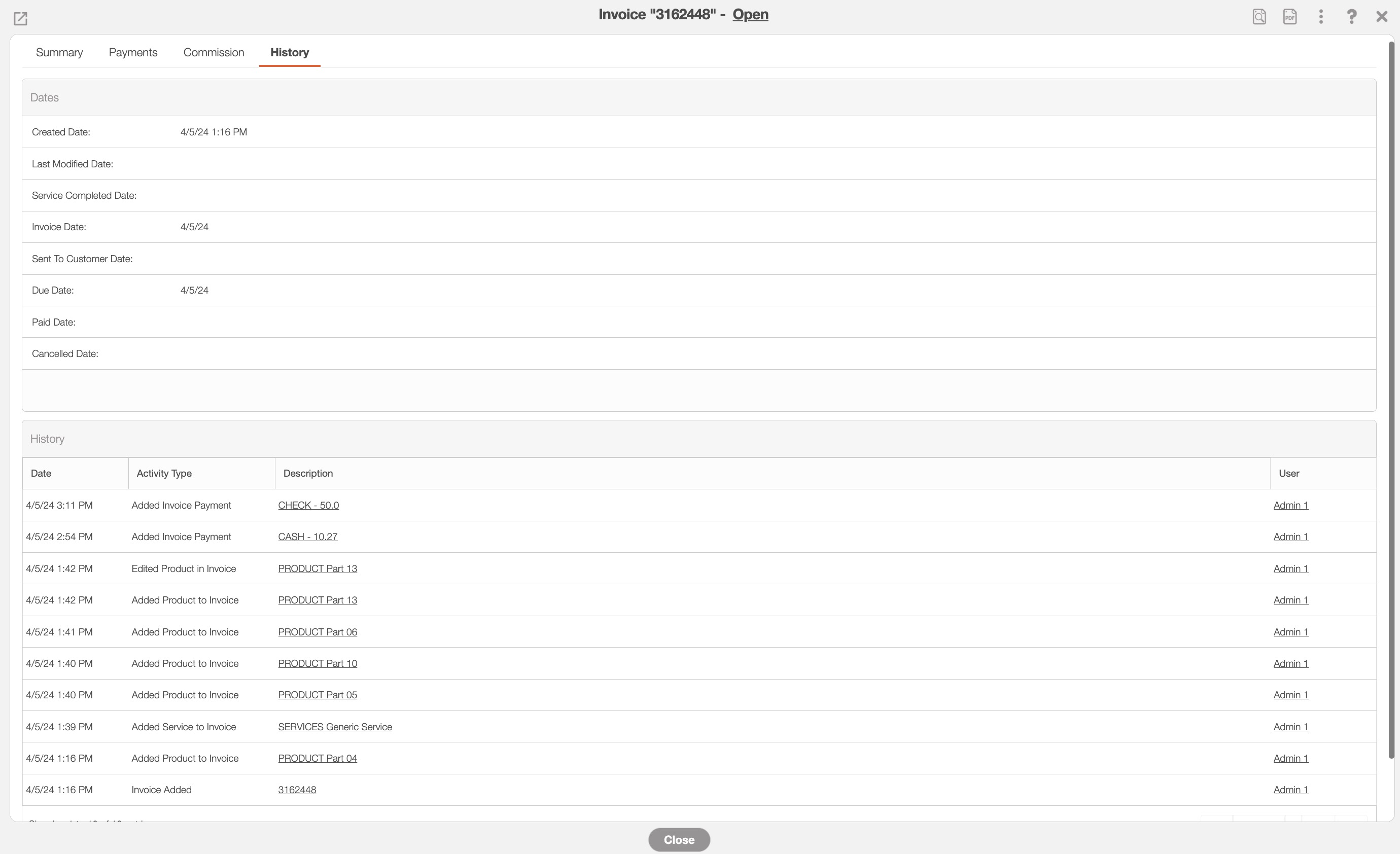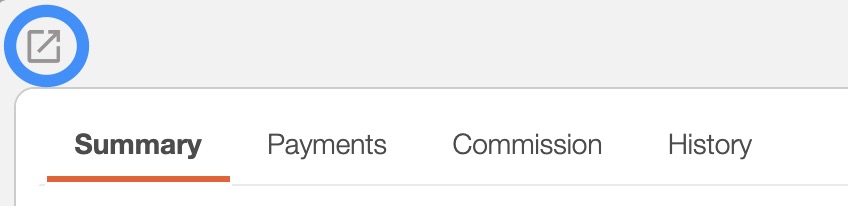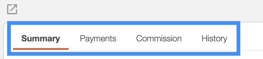 There are four tabs in the View Invoice pop-up window: "Summary," "Payments," "Commission," and "History." Each tab displays different information regarding the invoice: