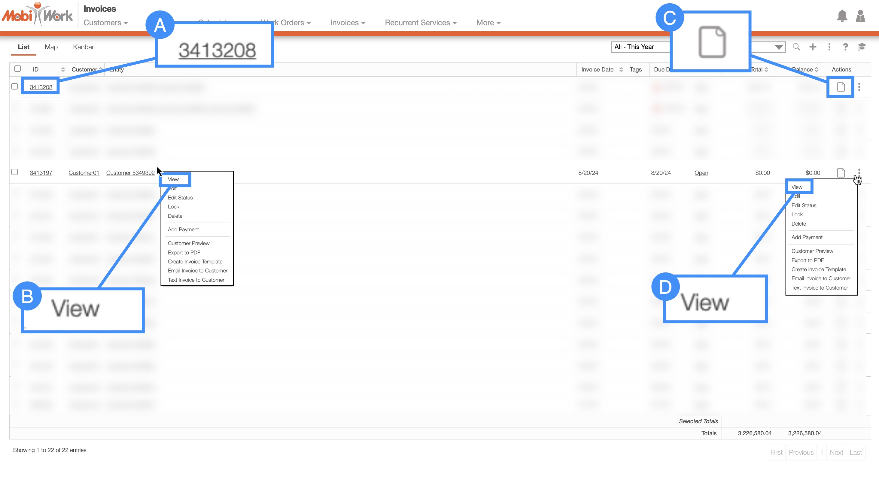 Once you are on the "List" tab, there are four different ways to access the View Invoice pop-up window from this screen: