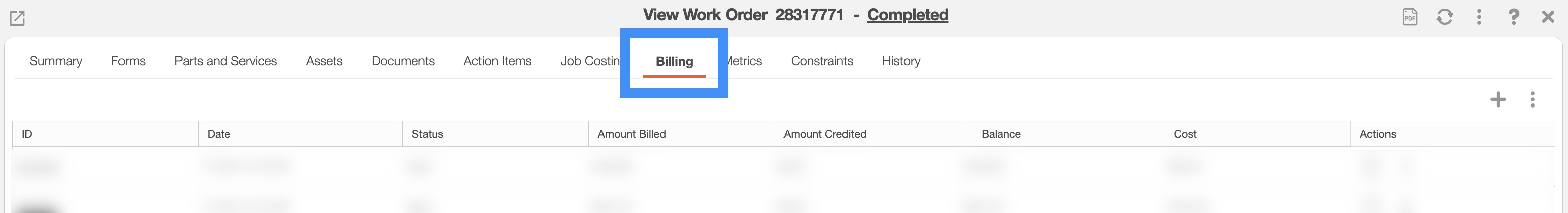 Once you have opened the View Work Order pop-up window, select the "Billing" tab: