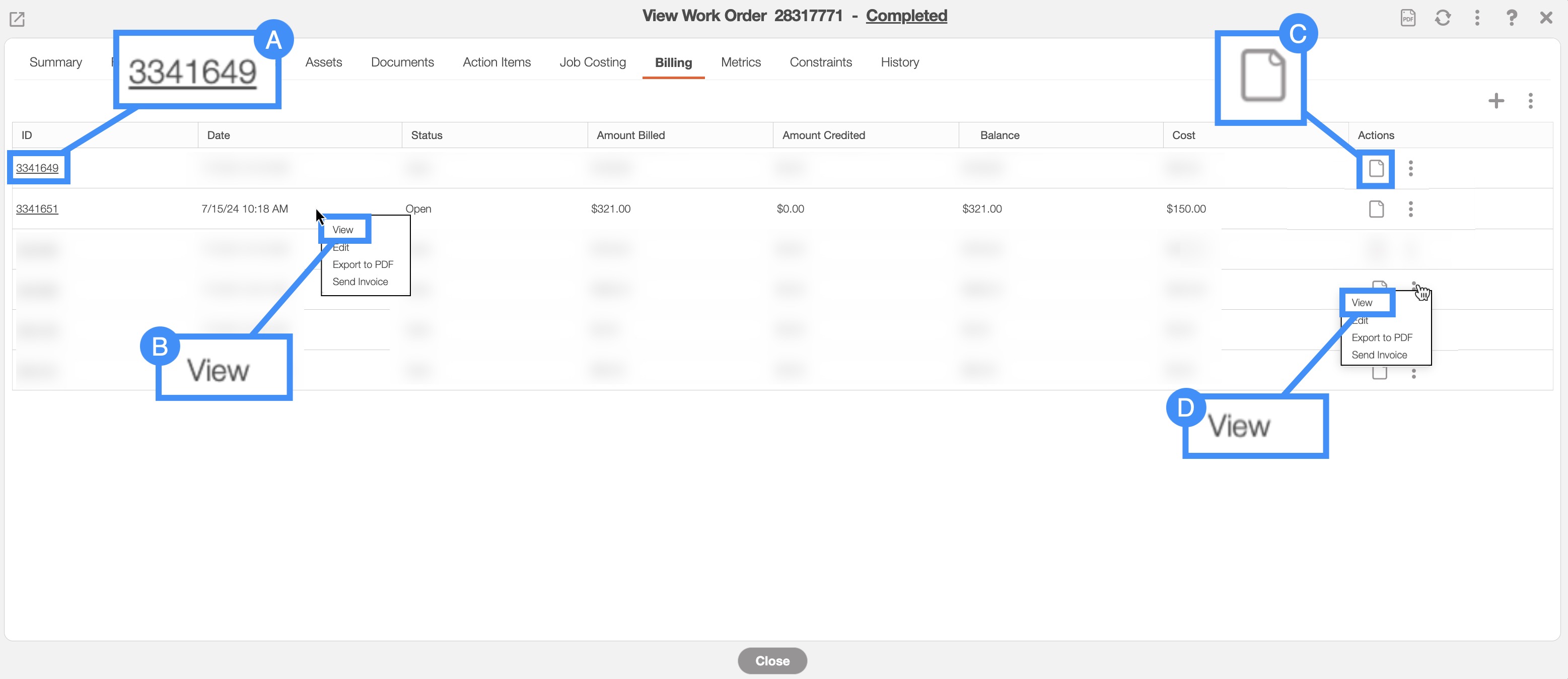 All the invoices associated with the work order will be displayed on this tab. To access an individual invoice and open its View Invoice pop-up window click on the following:
