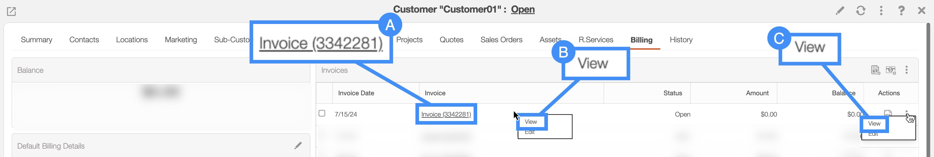 Once you have opened the View Customer pop-up window, select the "Billing" tab: