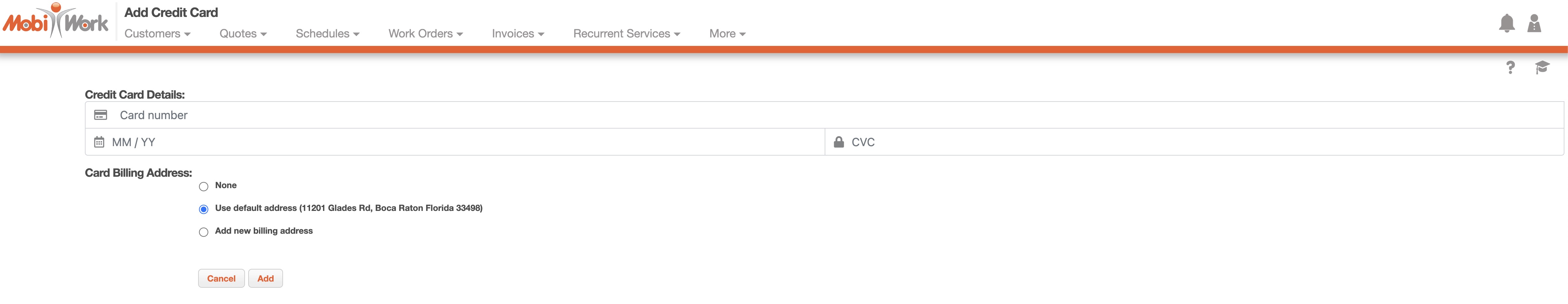 Within the MobiWork web application, you will be able to save credit card information for future payments. This information is added to the customer's file for later use.