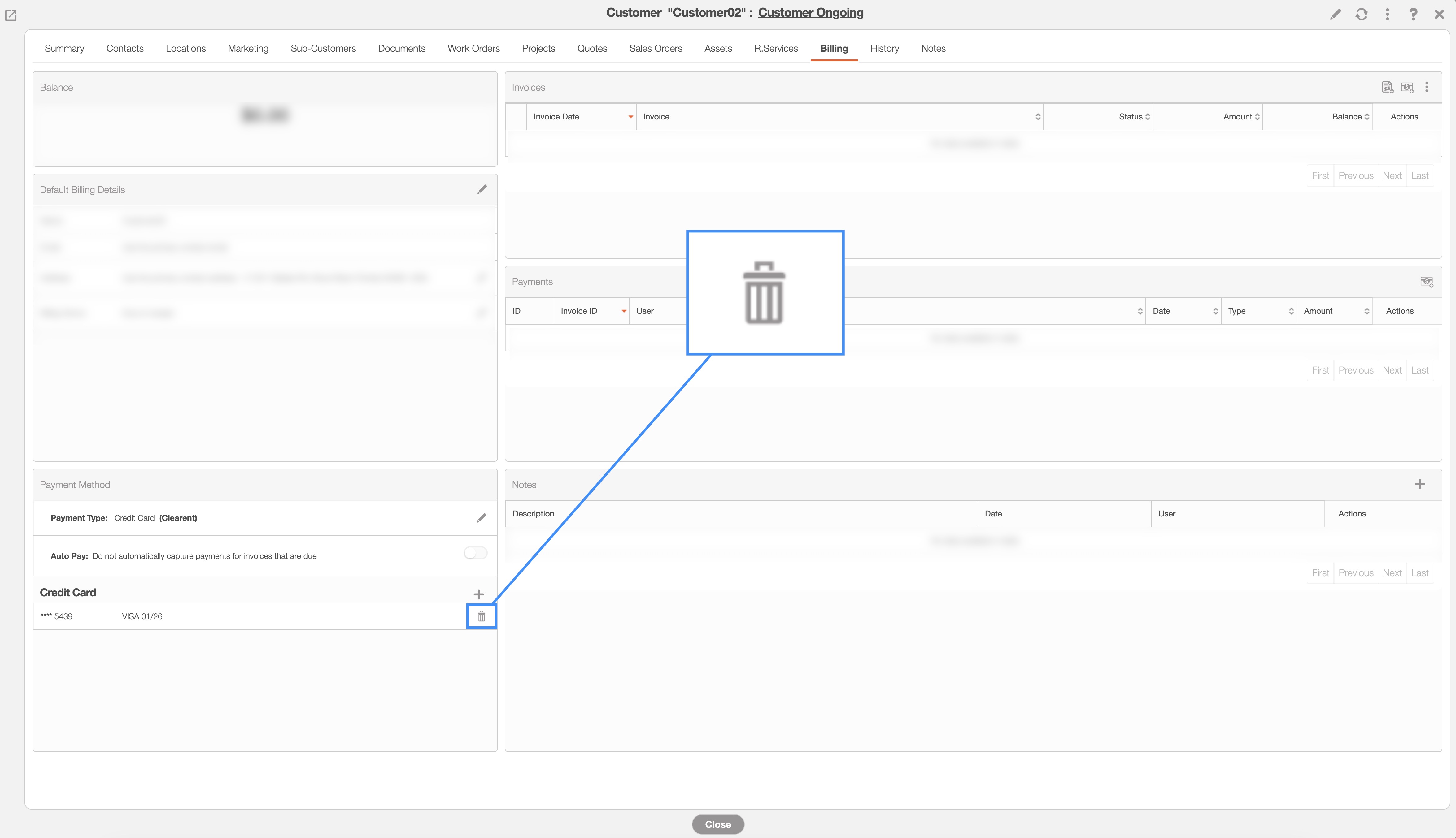 If you would like to remove a saved credit card from a customer's profile, you will first need to access the View Customer pop-up window. For more information on how to access this pop-up window, please see the View Customer page.