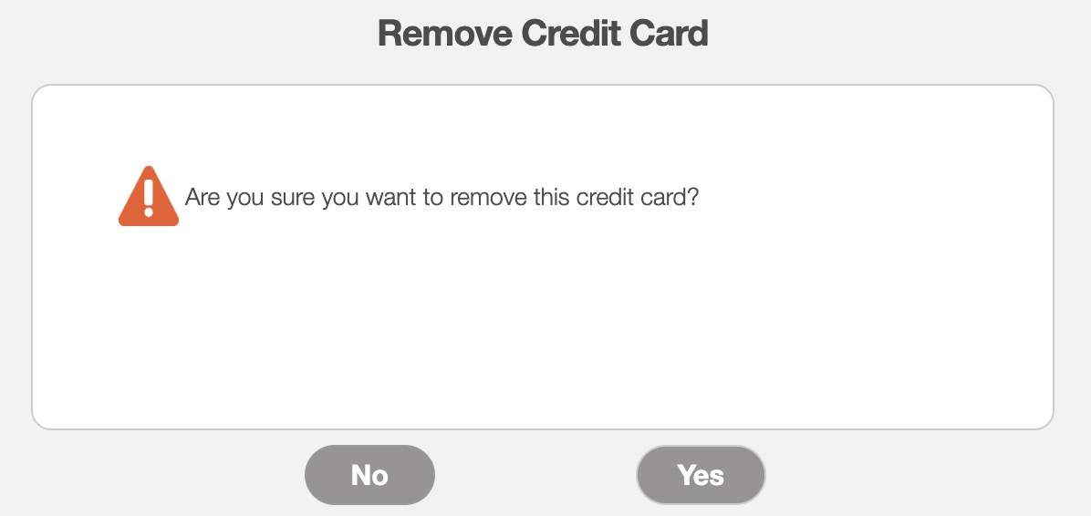 Under the "Credit Card" section, click on the Trash Can icon to access the Remove Credit Card pop-up window: