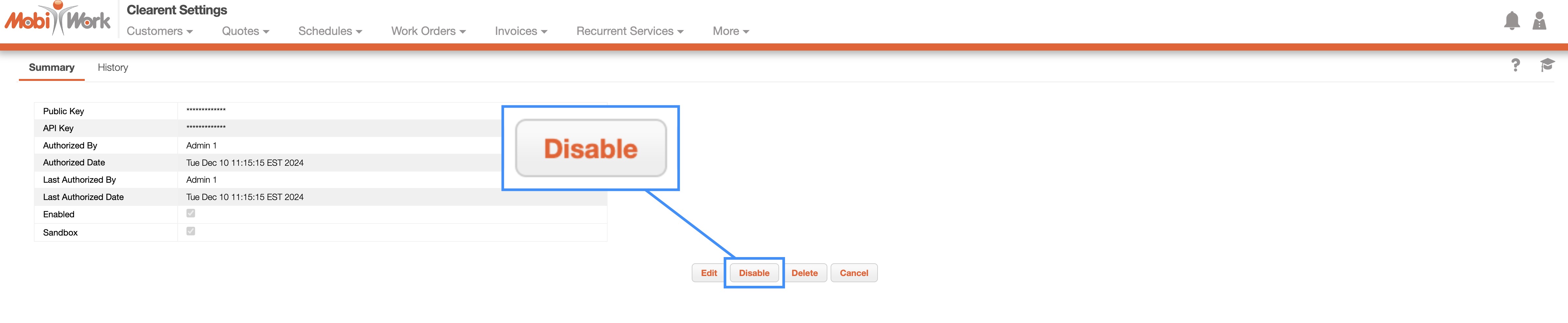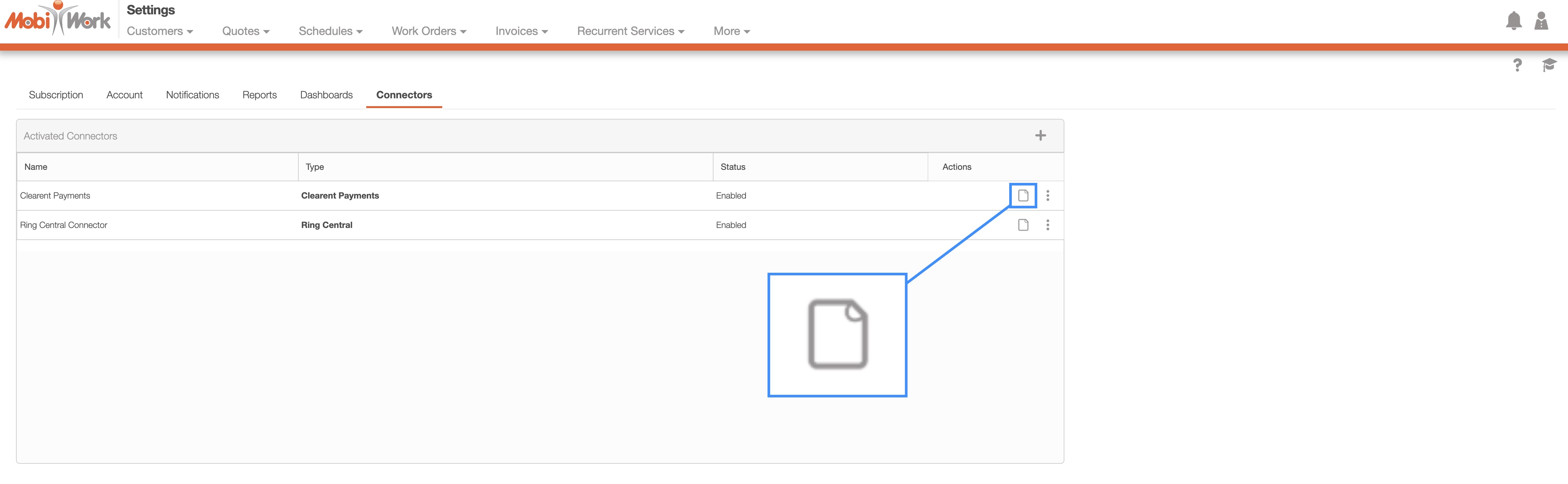 Also, please note that MobiWork only allows one payment connector per account. If your account already has another Payment Connector enabled, you must first disable it before setting up the Clearent Payments Connector.