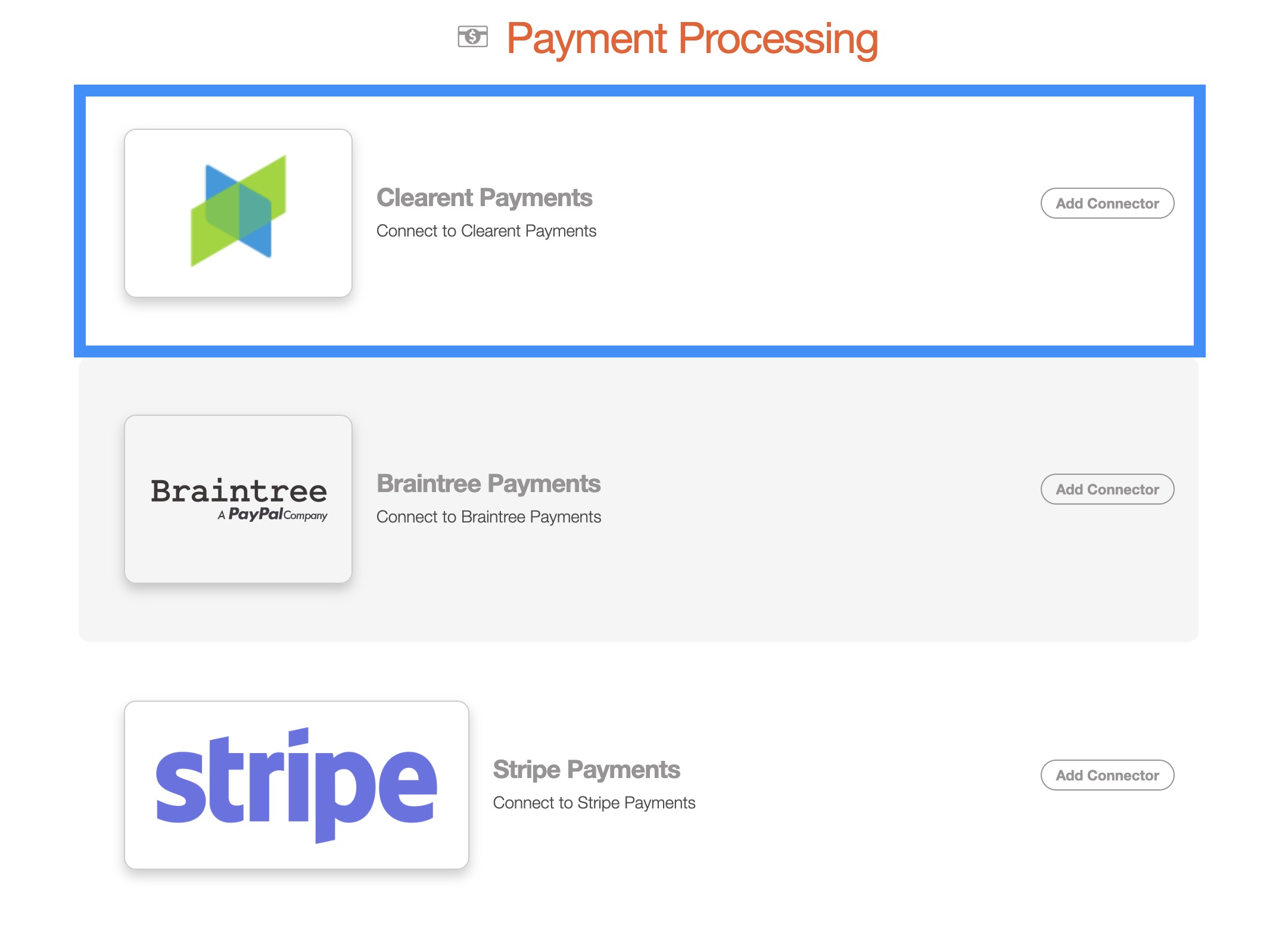 Next, scroll down to the "Payment Processing" section, find Clearent Payments listed and click Add Connector: