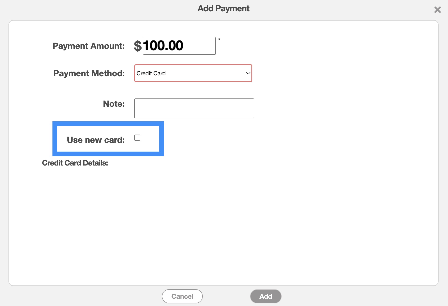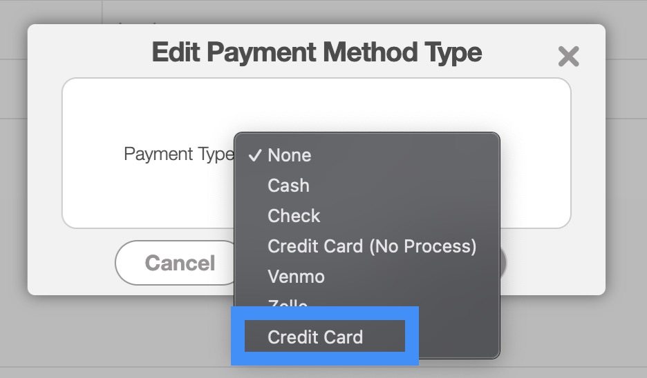 From the pop-up window that appears, select the "Credit Card" option from the drop-down. This will then show "Credit Card" as the payment method: