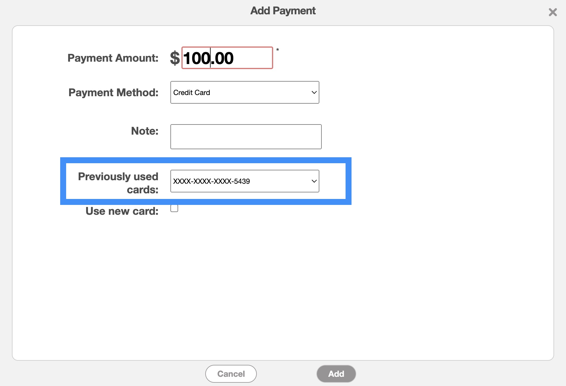 The next time you access the Add Payment pop-up window, you will be able to select the stored credit card information.