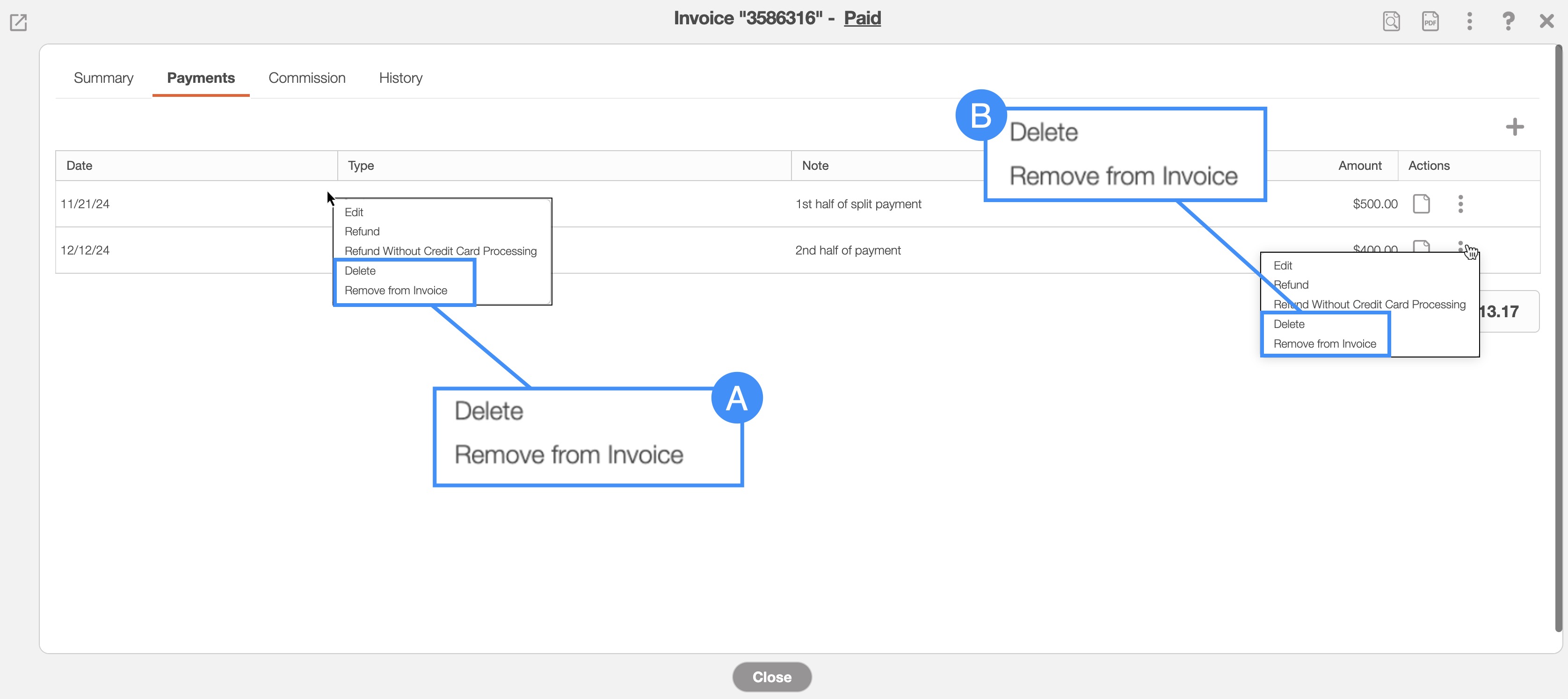 With clear prompts and streamlined navigation, you can confidently remove your payments or remove payments from selected invoices without disrupting your workflow. If you need to process a refund instead of deleting a payment, please see the Refund Payment page for more information.