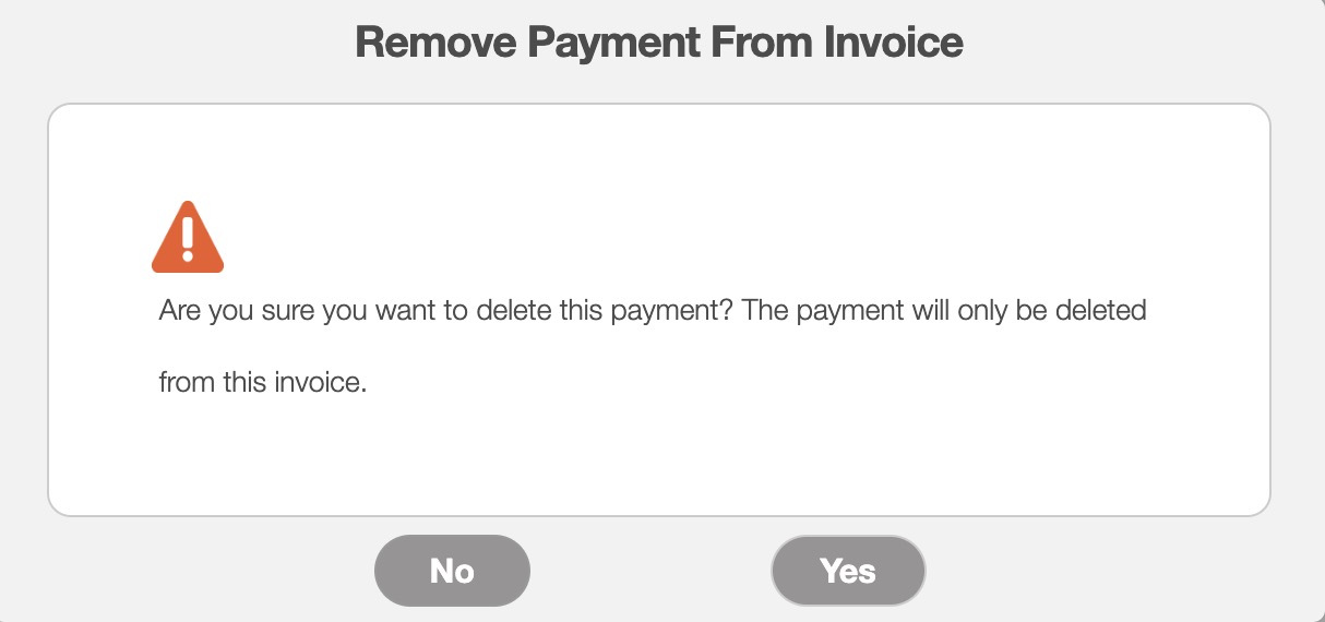 To confirm removal, click the Yes button. This action will remove the payment from the invoice and transfer the funds to the customer's credit: