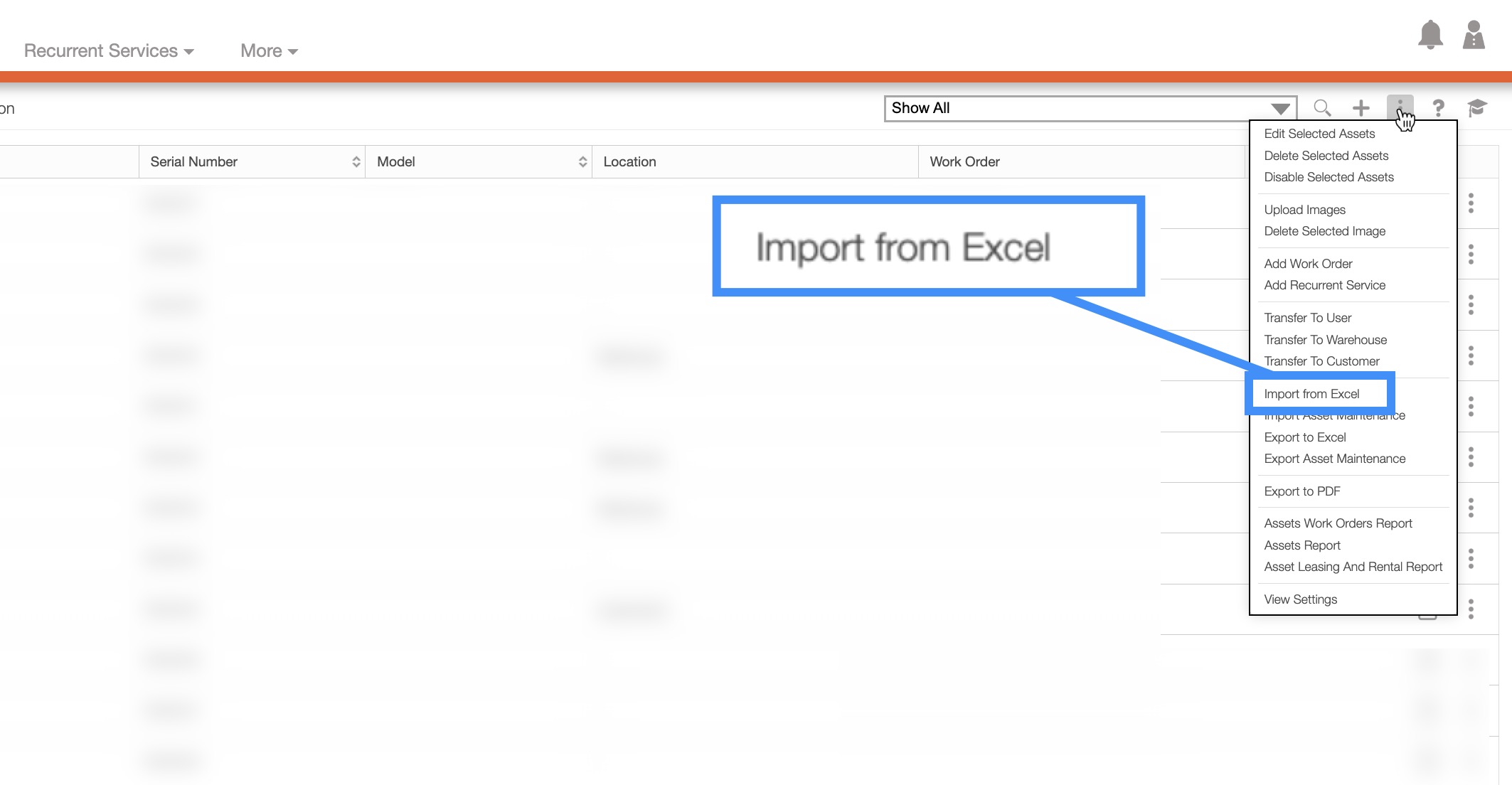 When you are on the Assets feature page, select the More Actions button and from the drop-down click on the "Import From Excel" option: