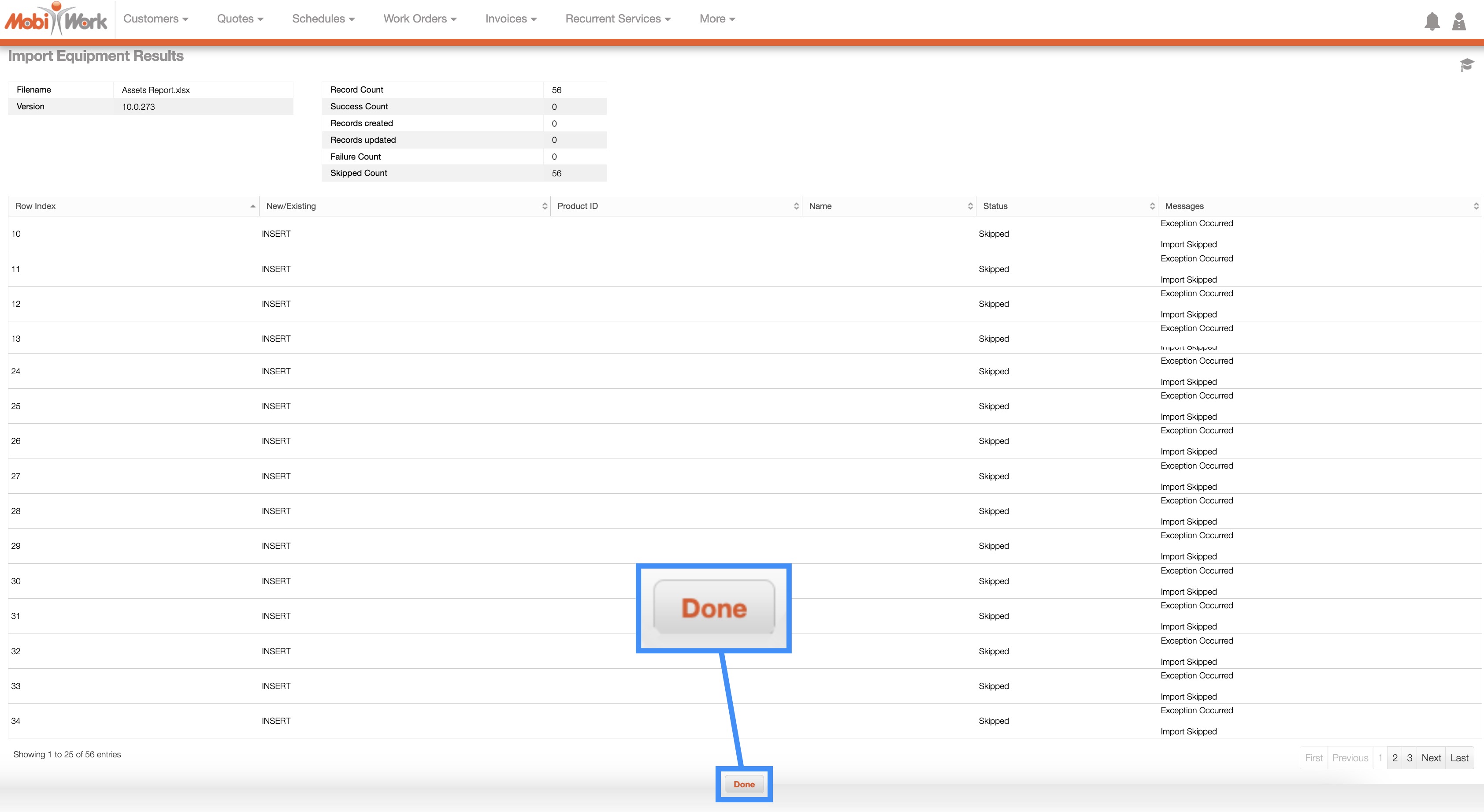 Once you are redirected to the Import Work Order Results page, click the Done button: