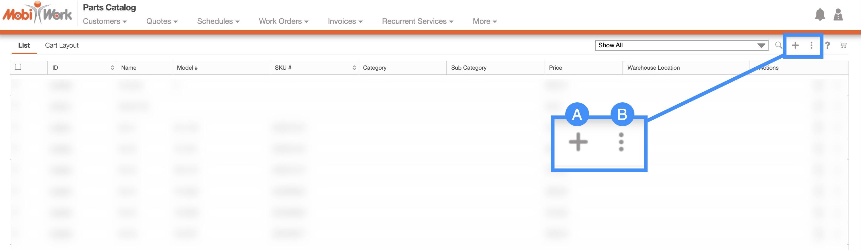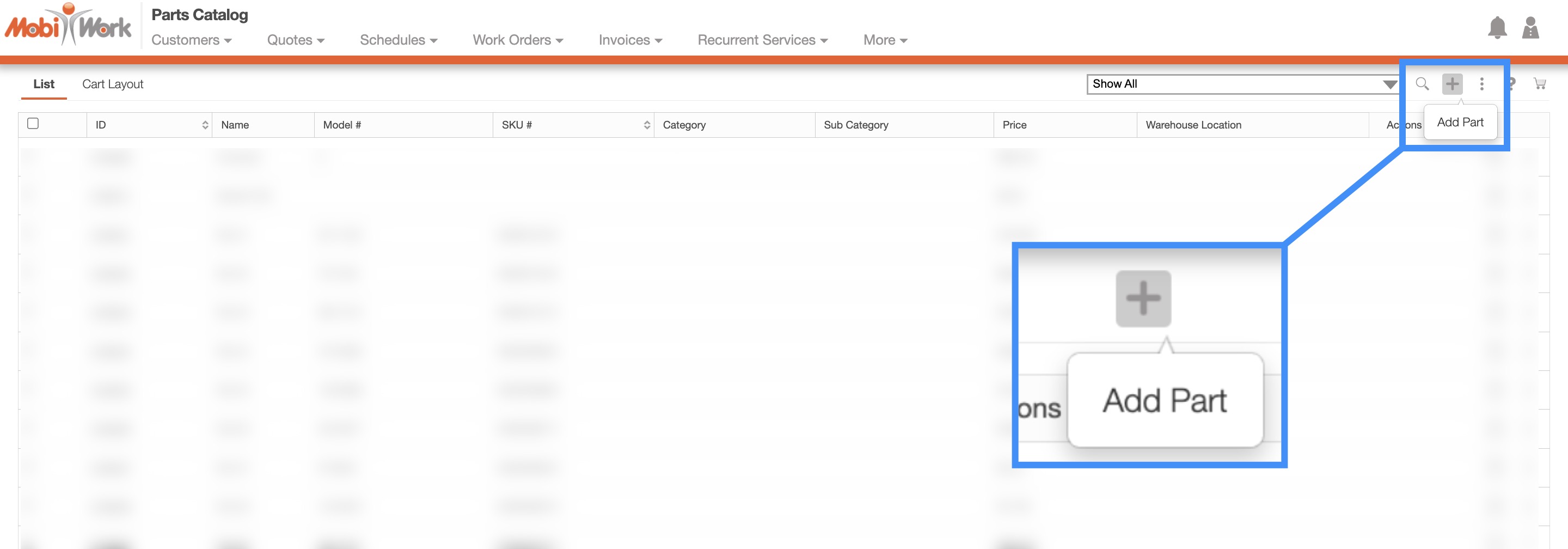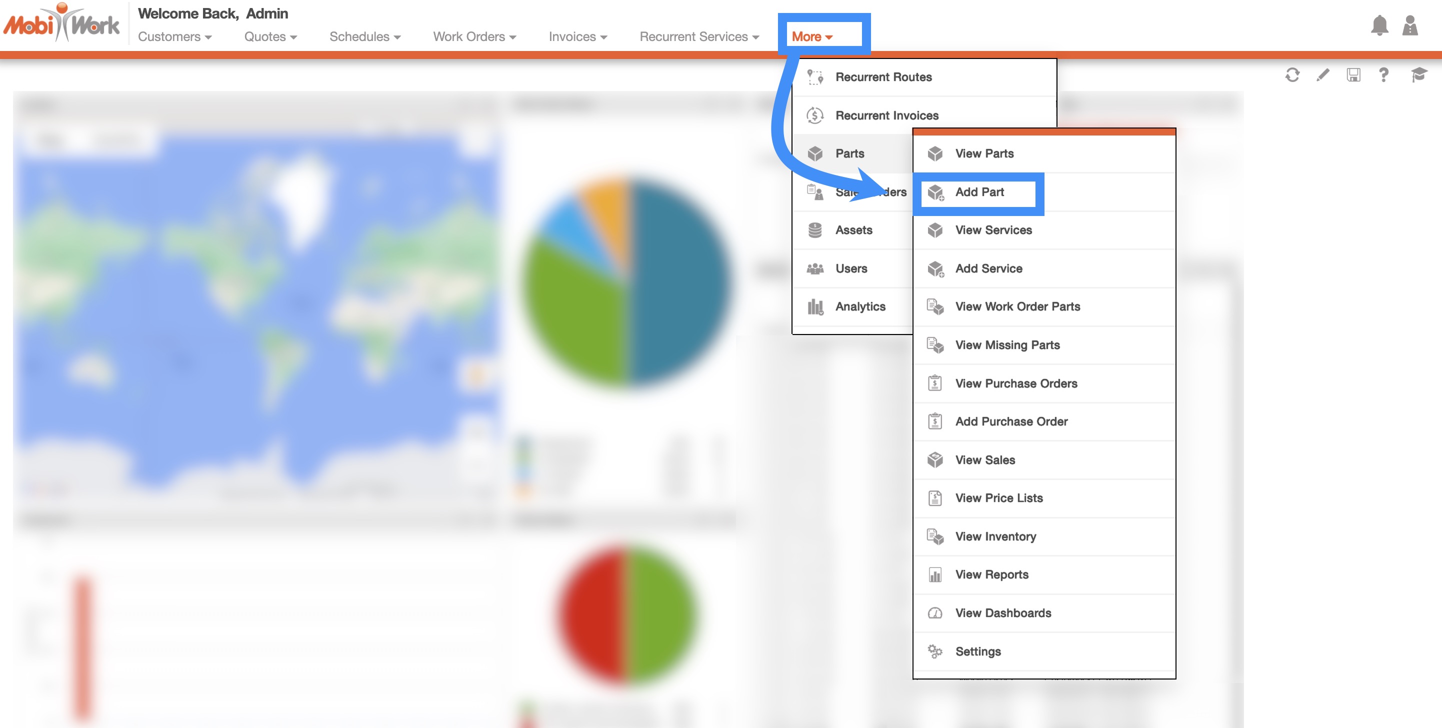 - The fastest and easiest way to add a new part is by accessing the drop-down menu from the Parts feature located in your MobiWork menu: