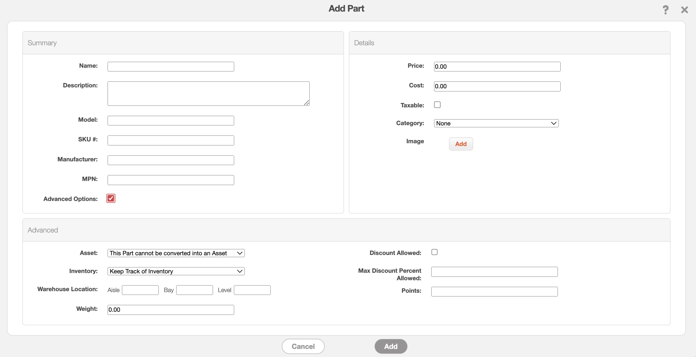 | "Advanced Options" | By clicking the "Advanced Options" checkbox, you will be able to input additional information about the part; this includes the warehouse location, inventory tracking, and more. |