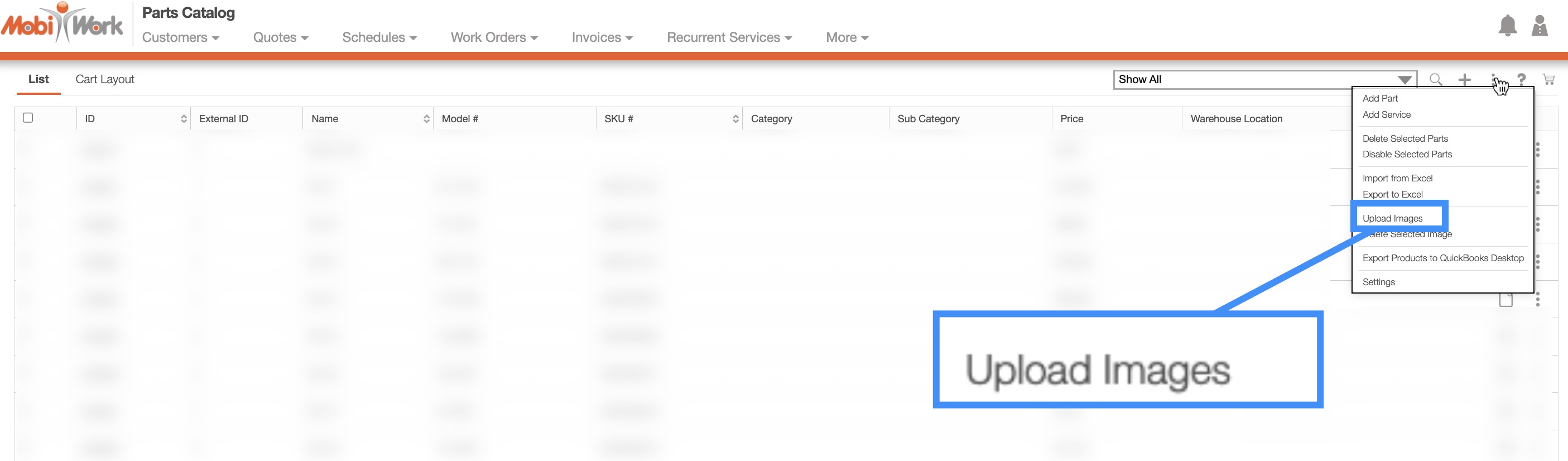 Once you are on the Parts "List" tab, access the "Upload Images" option from the More Actions button: