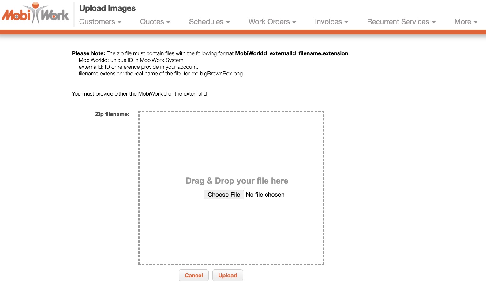 You will then be redirected to the Upload Images page; on this page, select the zipped image file that you would like to upload to MobiWork. Once you are satisfied with the document, click on the Upload button: