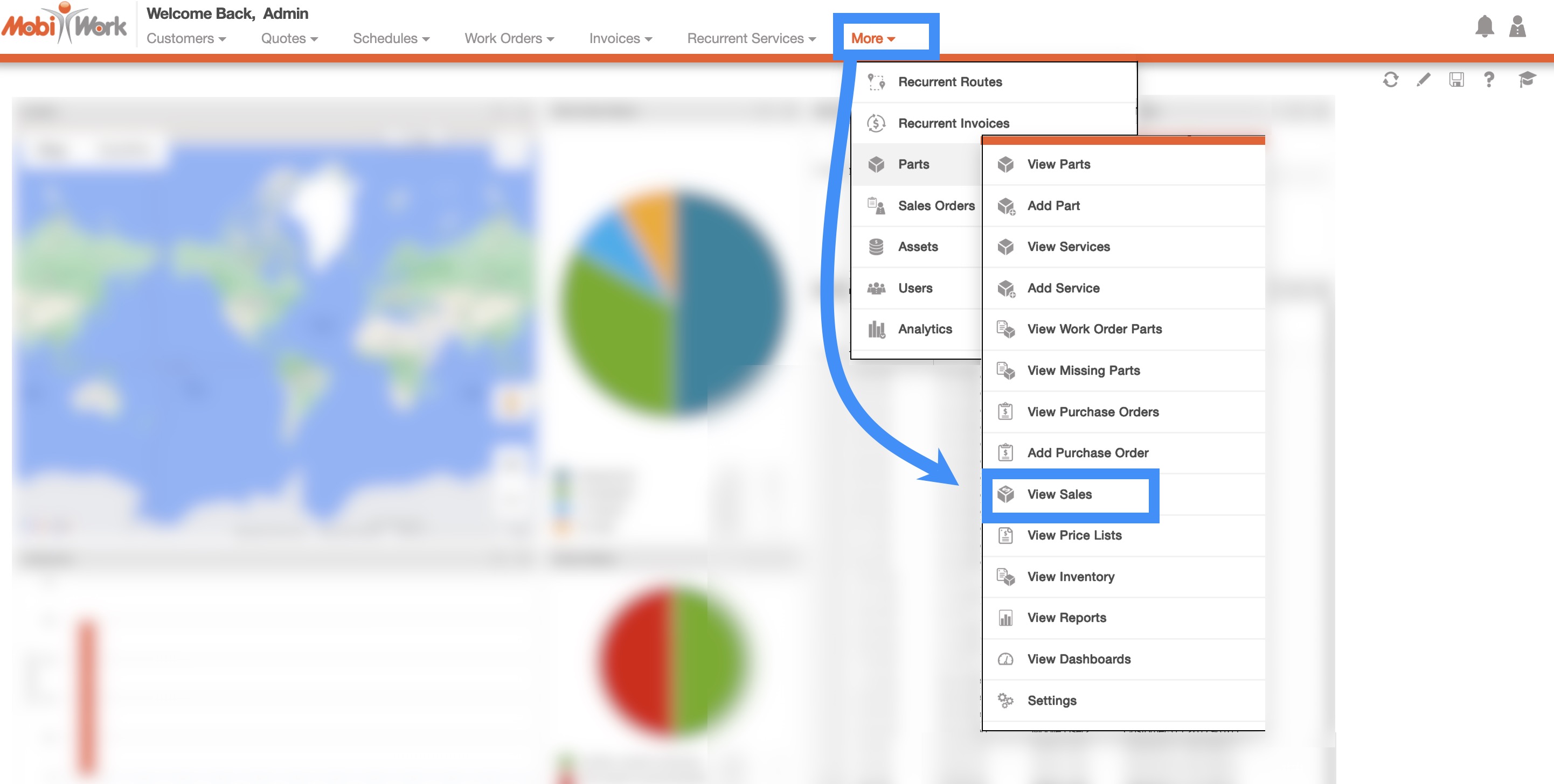 You can access the Parts Sales page by hovering over the Parts feature from your MobiWork menu and clicking on the "View Sales" option when it appears: