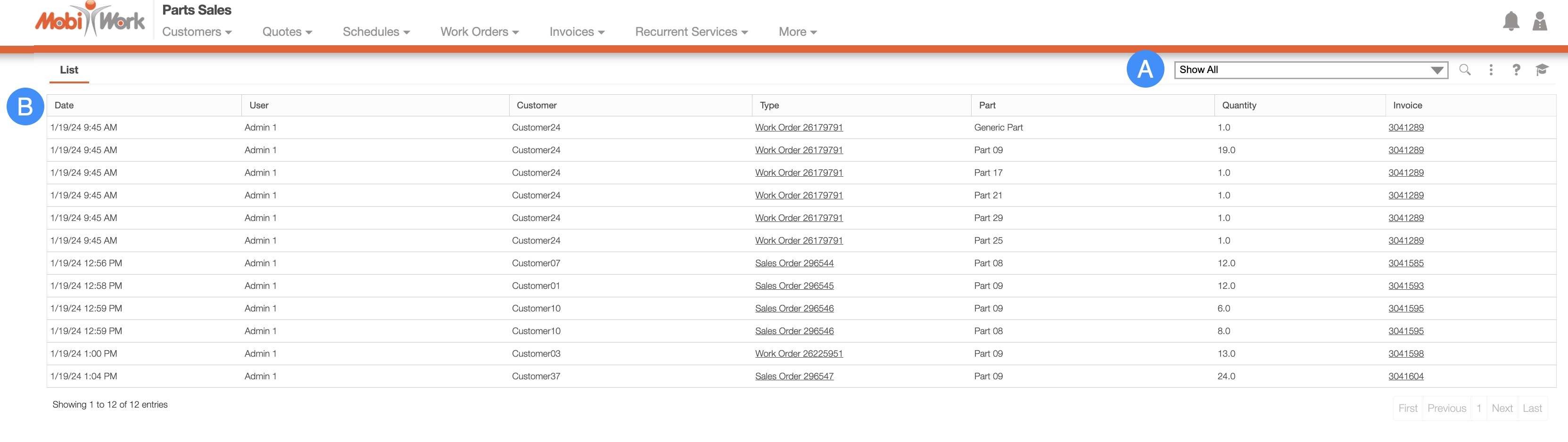 The "List" columns will display the corresponding data related to the specified sales orders, work orders, and invoices including the user who made the sale, the date the sale occurred, and the customer who bought the part or service