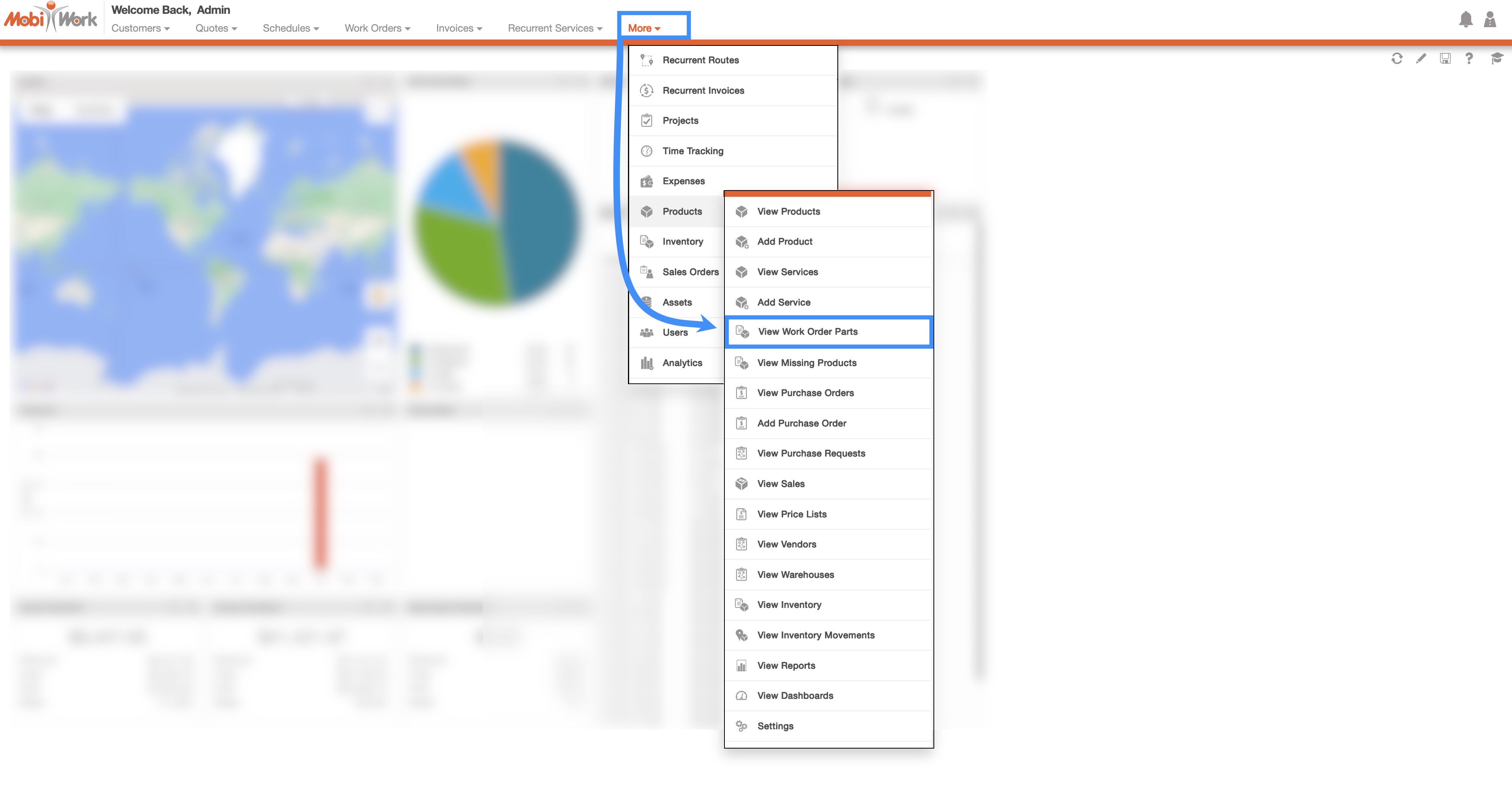 You can access the Work Order Parts feature page by hovering over the Products feature from your MobiWork menu; from the drop-down that appears click on the "View Work Order Parts" option: