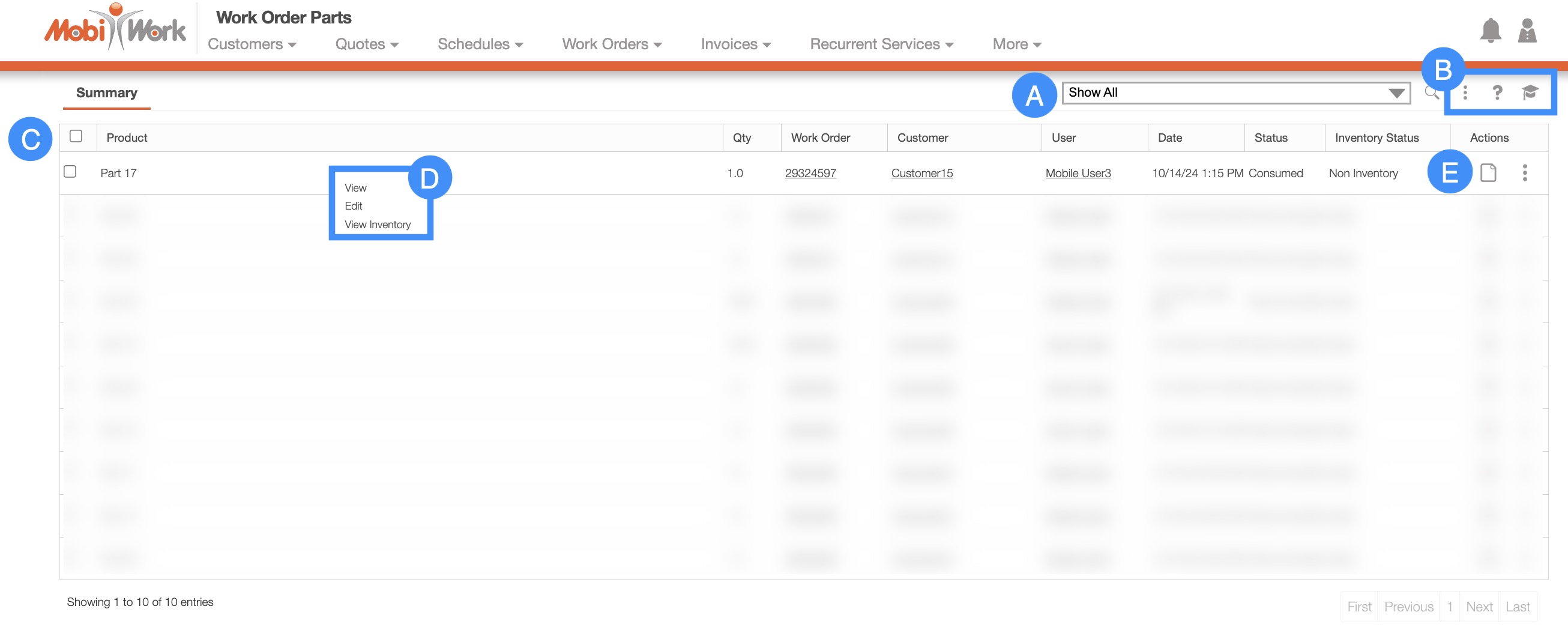 When selecting a work order and clicking on the Individual Actions button (the three vertical dots under the "Actions" column) you will be able to view, edit, and view inventory to the selected work order part.
