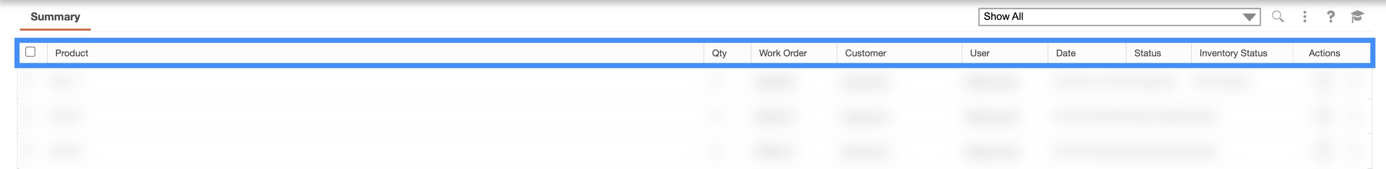 These columns are organized as: "Product," "Qty," "Work Order," "Customer," "User," "Date," "Status," "Inventory Status," and "Actions:"