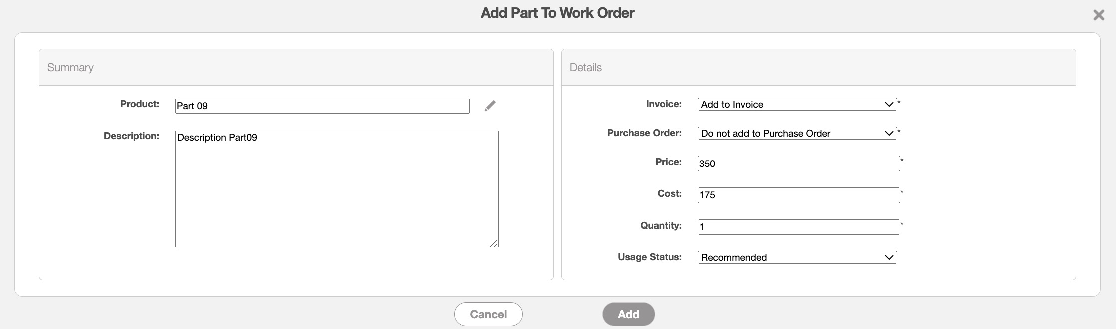 Once you click the Add button, the part will automatically be added to both the View Work Order pop-up window and the Work Order Products page.