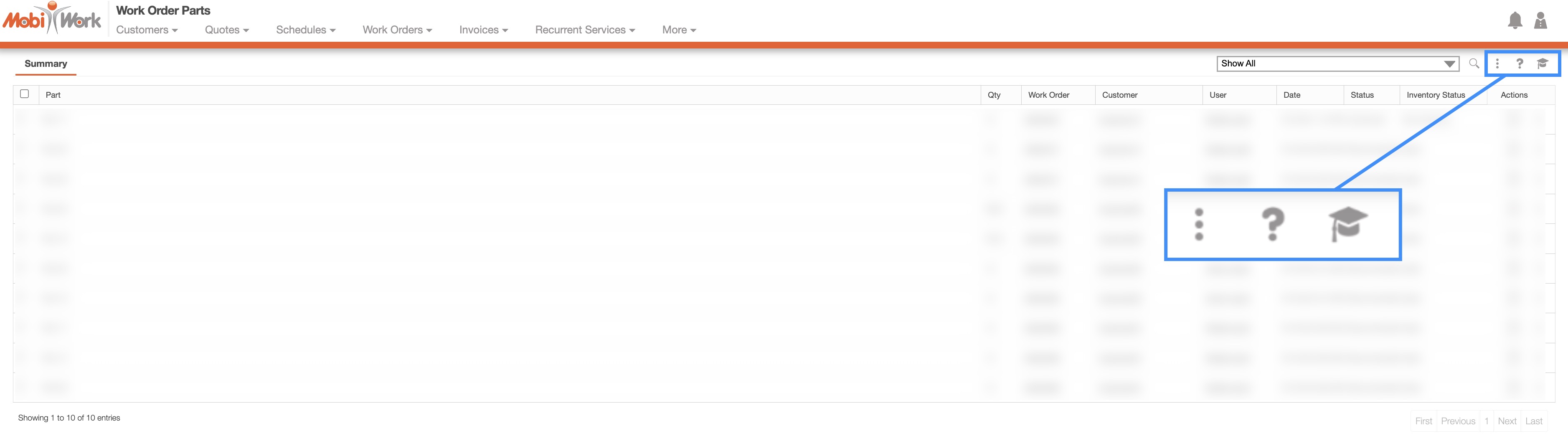 The Question Mark button which will direct you to the respective MobiWork Features page.