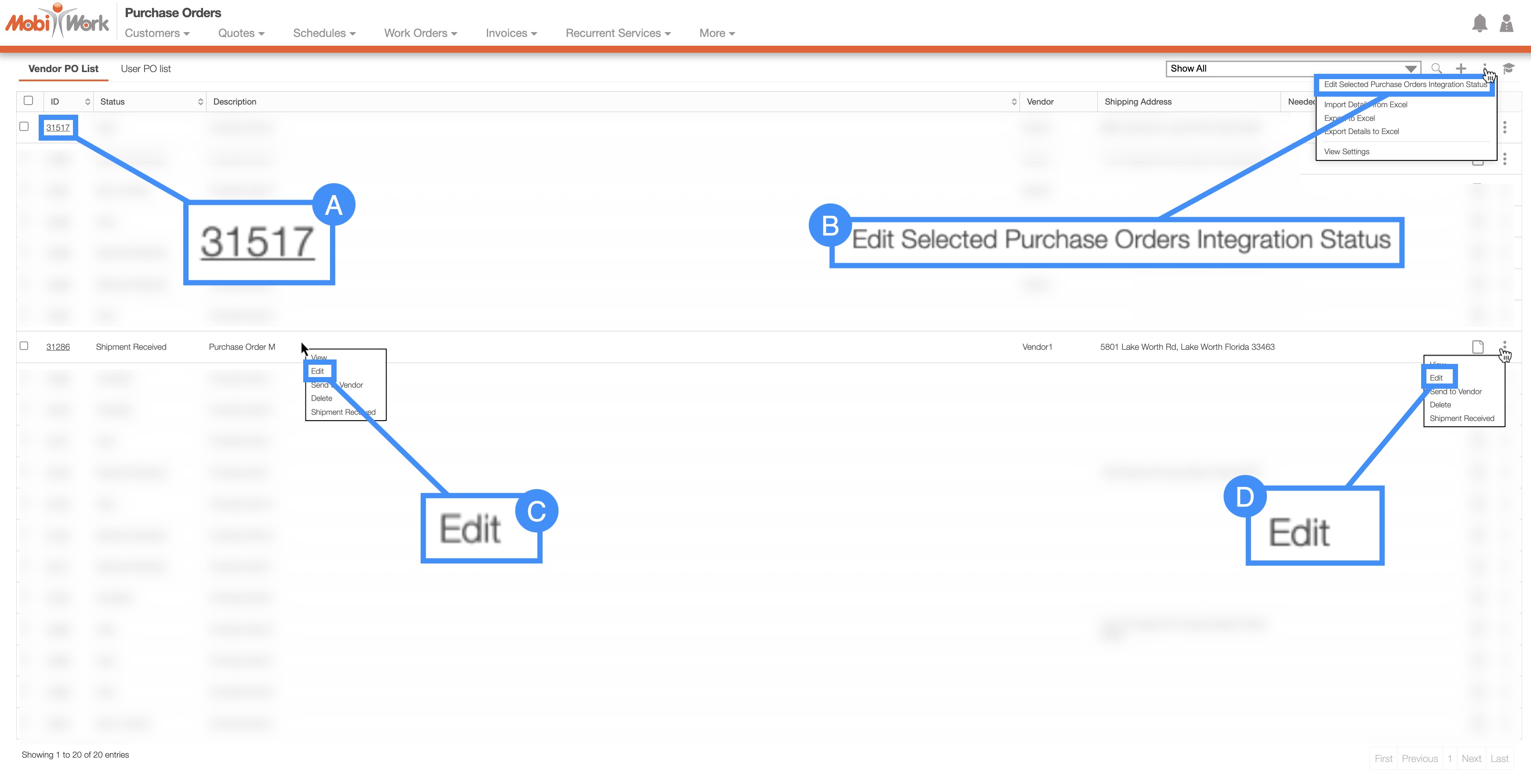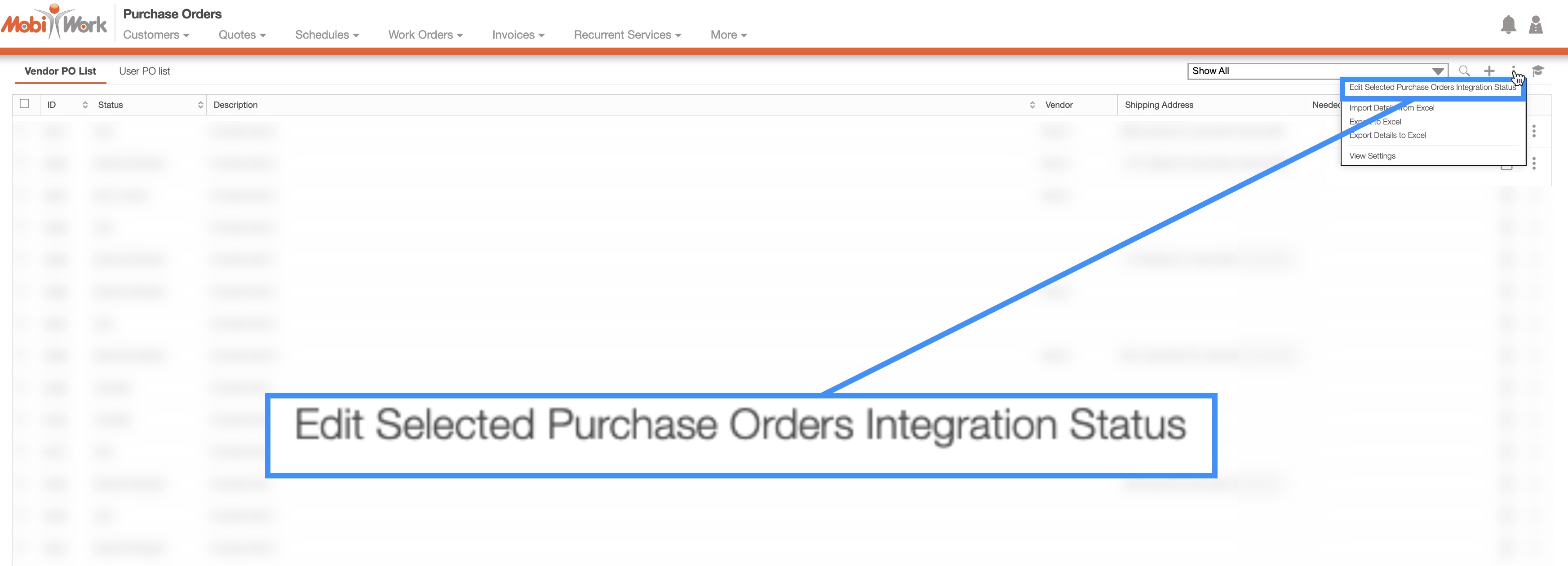 MobiWork allows you to edit multiple purchase orders at once, thus saving you time from having to update purchase orders one at a time. You can update multiple purchase orders in two ways: through the More Actions button or through Excel.