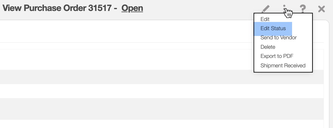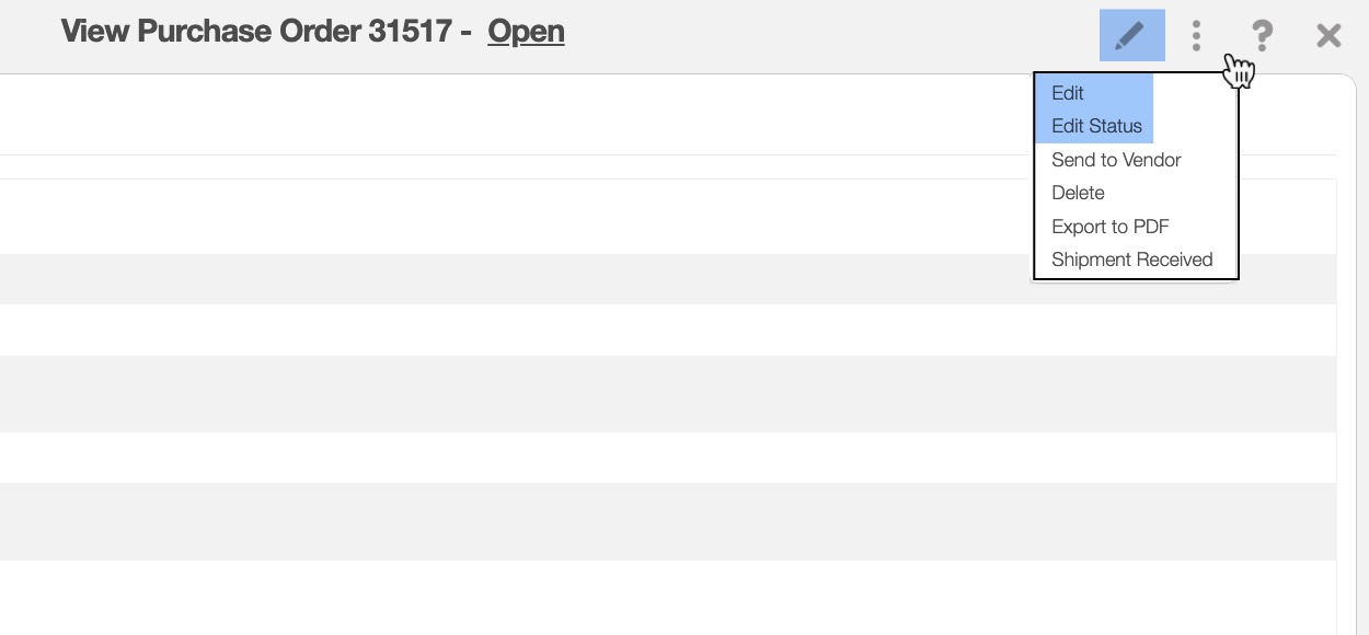 - Click on the purchase order ID to open the Purchase Order pop-up window. Then click on the Pencil icon, the "Edit" option, or the "Edit Status" option from the Individual Actions drop-down: