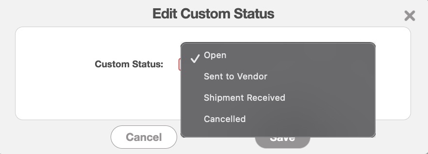 | "Custom Status" | The status of the purchase order. The status can be "Open," "Sent to Vendor," "Shipment Received," or "Cancelled." |