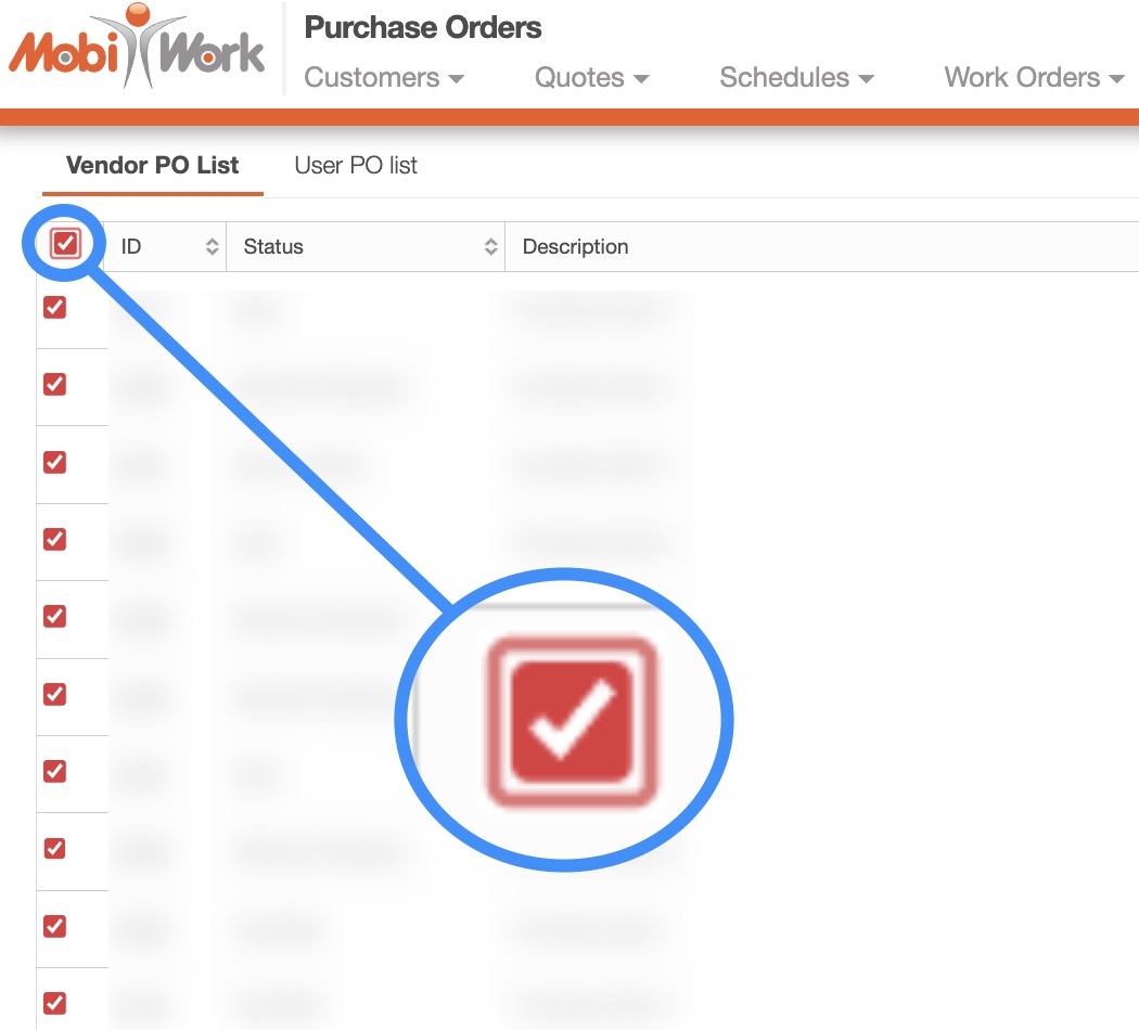 Check off the desired purchase orders you would like to edit; if you would like to edit all your purchase orders you can click on the topmost checkbox (Multiple Selection Area) located in the Purchase Order "Vendor PO List" or the "User PO List" columns: